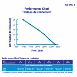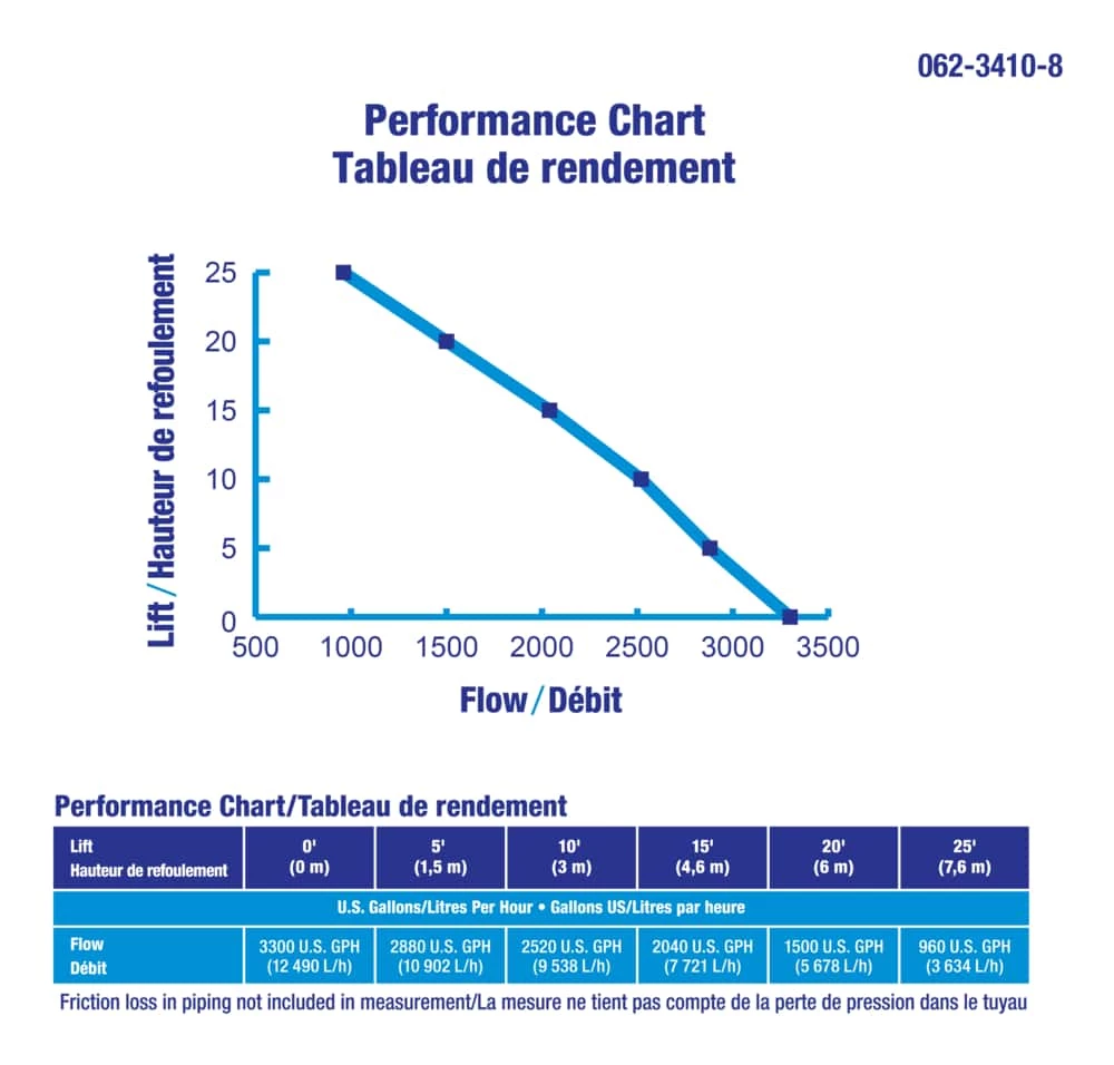 - 1/2 HP motor provides 3300 US gal/hour flow rate at 0′