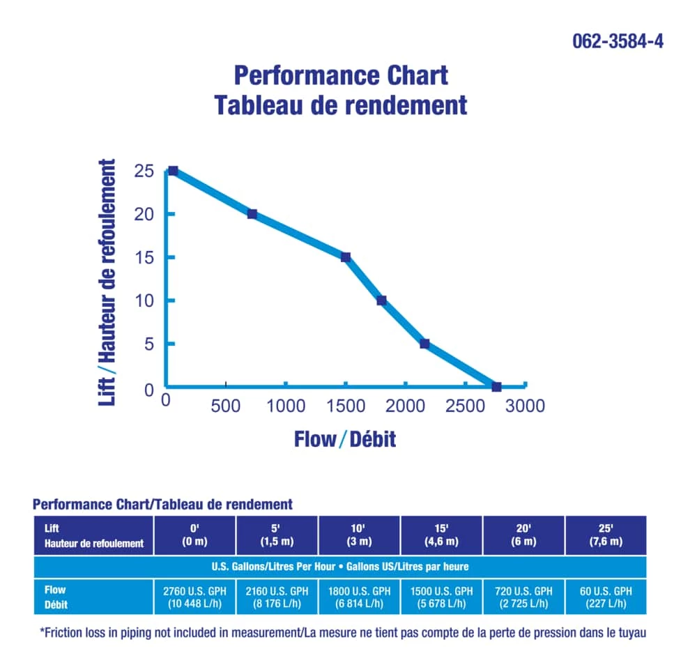 - 1/3 HP motor provides 2760 US gal/hour flow rate at 0′
