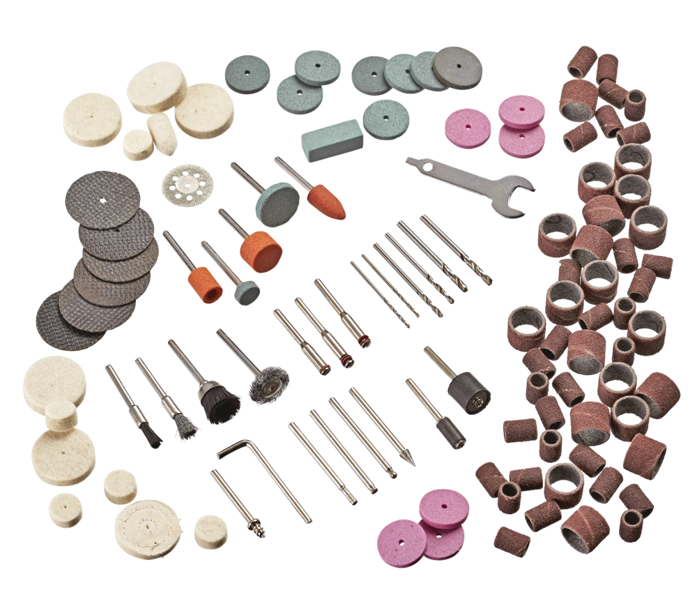 - Includes a 250-piece accessory kit that contains: 6 collets (1.6 mm, 2.3 mm, 3.2 mm), 8 sanding drums (12.7 x 12.7 mm and 6.3 x 12.7 mm), 2 sanding rolls (12.7 x 12.7 mm, 6.3 x 12.7 mm), 1 brush (shank: 3.2 mm), 2 high-speed steel cutters (shank 3.2 mm), 3 high-speed steel twist drill bits (shank: 1.6 mm, 2.3 mm, 3.2 mm), 1 diamond grinding bit (shank: 3.2 mm), 10 grinding bits (shank: 3.2 mm), 1 saw blade and mandrel, 88 cutting discs and mandrel, 3 wool polishing wheels (6.3 x 25.4 mm, 6.3 x 12.7 mm, 9.5 x 19 mm) and mandrel, 2 rubber polishing wheels (4 x 22 mm), 1 cloth wheel (4.5 x 25 mm), 12 grinding discs (3.2 x 20 mm), 1 polishing compound, 90 sanding papers (fine, medium and coarse), 1 grinding stone and wrench