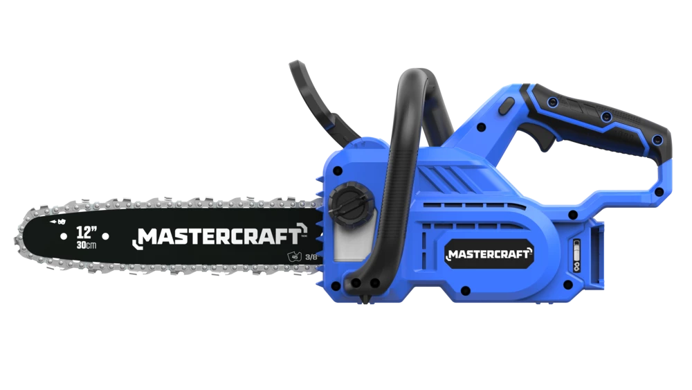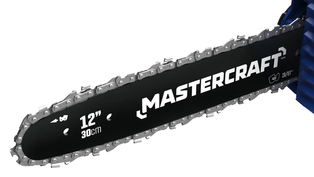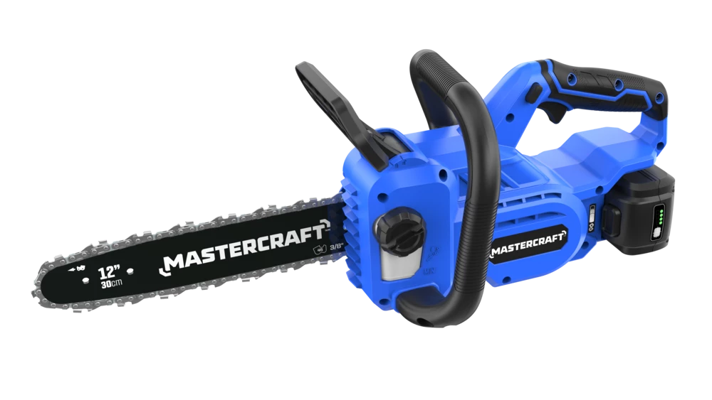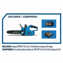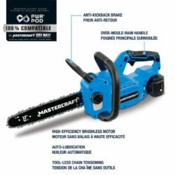 - Mastercraft 20V 12″ Cordless Chainsaw features a high efficiency brushless motor