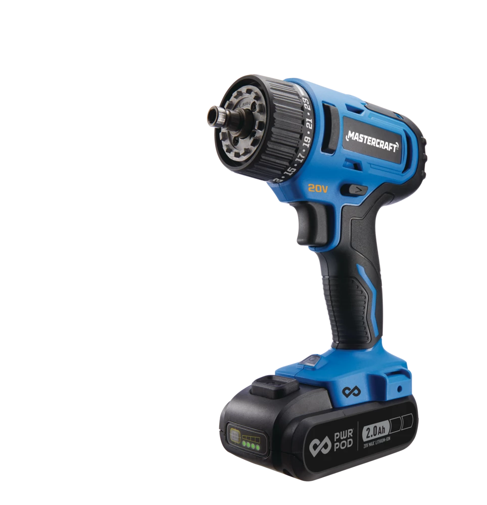 Mastercraft 20V Brushed 3-in-1 Multi-Head Cordless Drill Kit is powered by PWR POD, Canada’s ultimate Universal Battery System. PWR POD allows you to use the same battery to seamlessly power your yard work, home renovations, automotive projects, outdoor adventures and more across exclusive brands like Mastercraft, Simoniz, Woods, and MotoMaster.