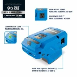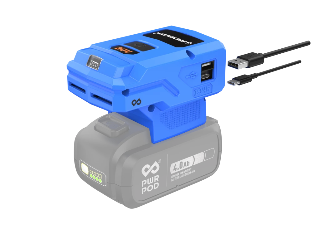 Mastercraft 20V Power Inverter is powered by PWR POD, Canada’s ultimate Universal Battery System. PWR POD allows you to use the same battery to seamlessly power your yard work, home renovations, automotive projects, outdoor adventures and more across exclusive brands like Mastercraft, Simoniz, Woods, and MotoMaster.