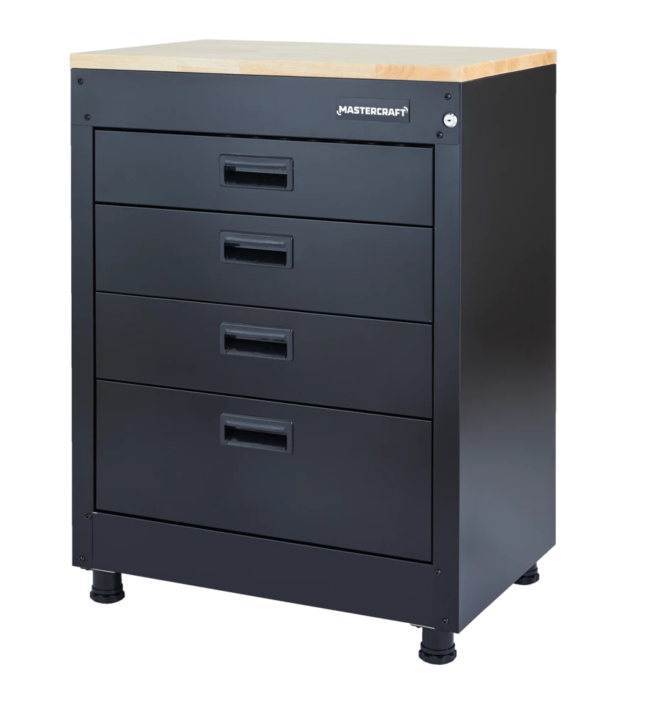 - Store your tools and other shop items in the Mastercraft 4-Drawer Base Cabinet with Wood Top