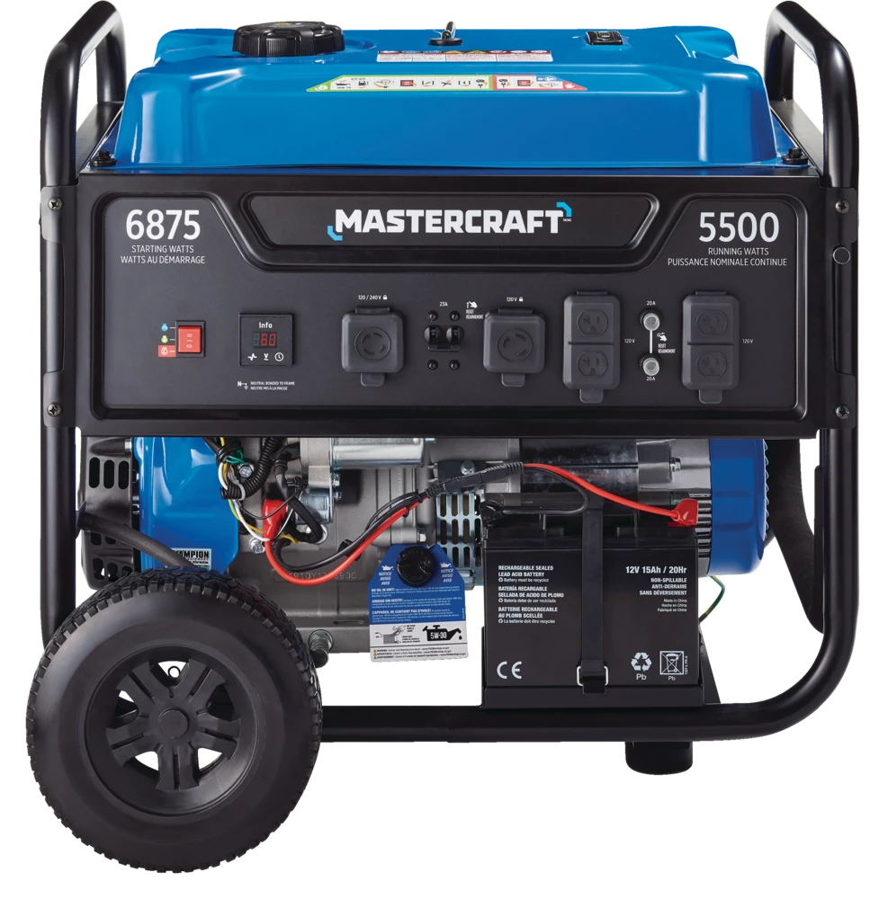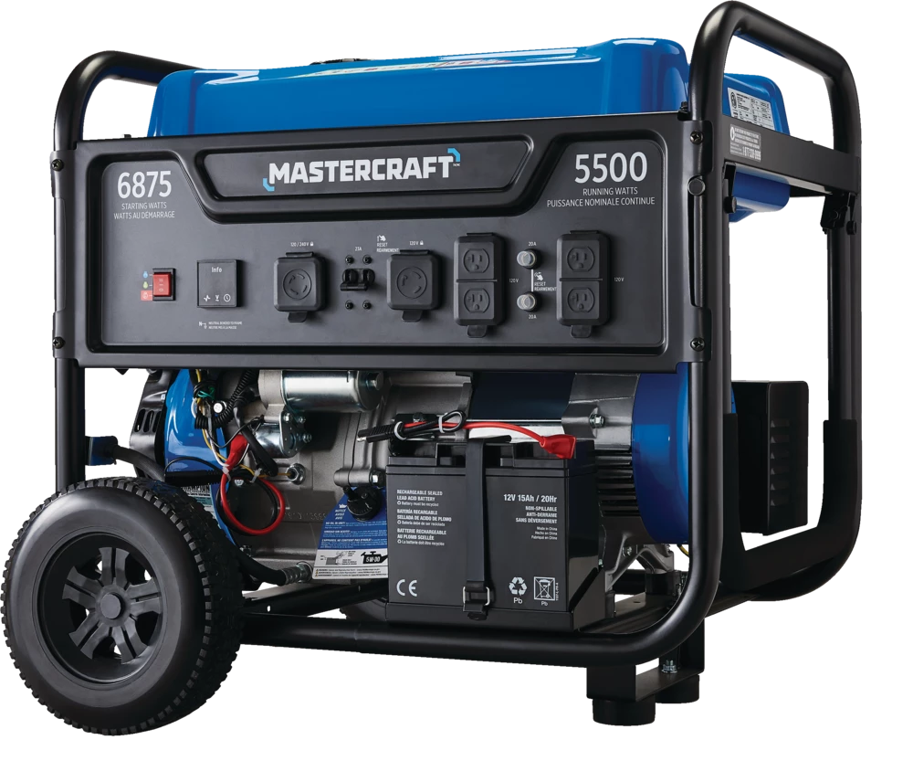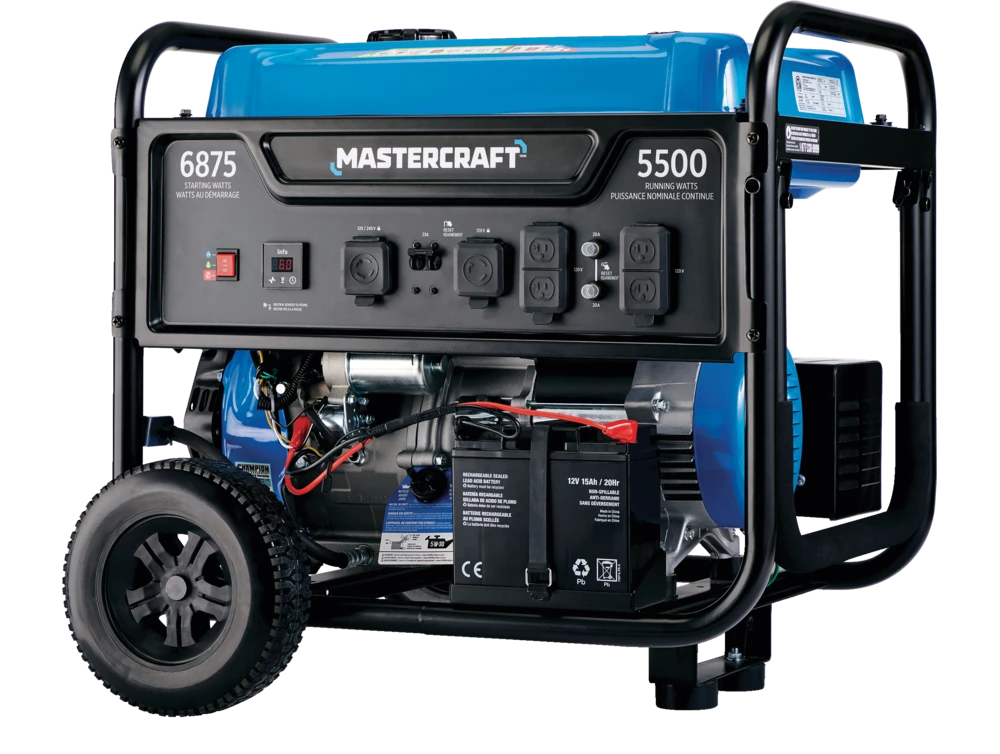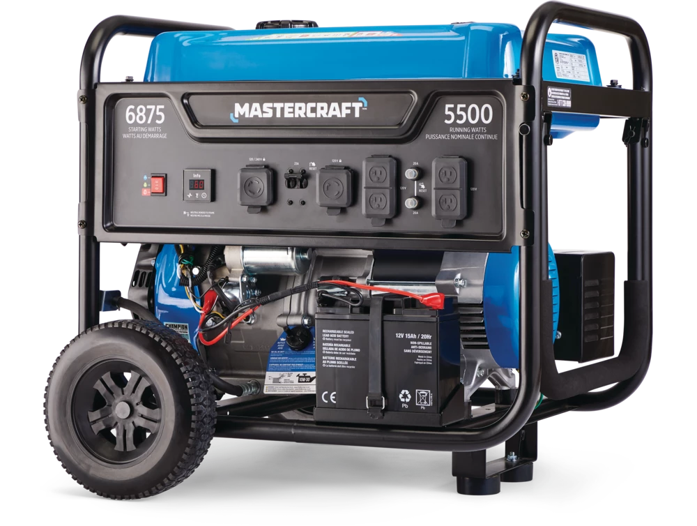 - Mastercraft 5500W Open Frame Generator with Electric Start is powered by a 389cc OHV gas engine