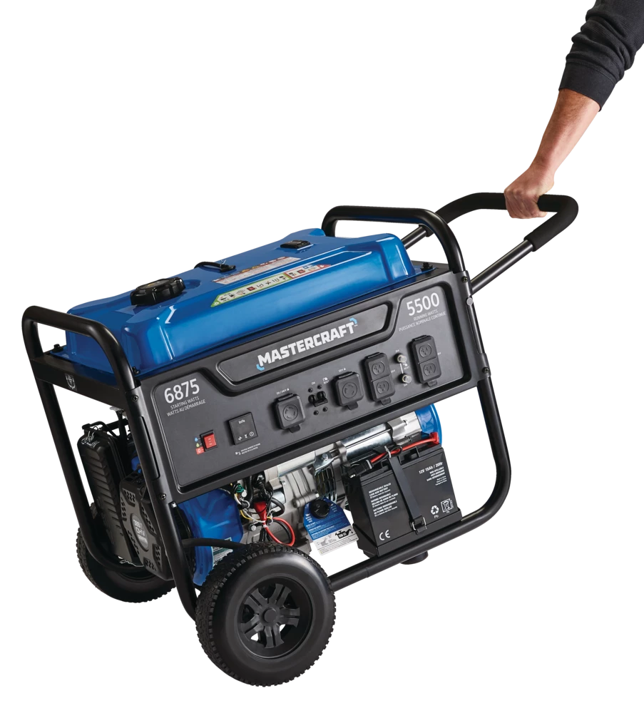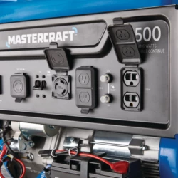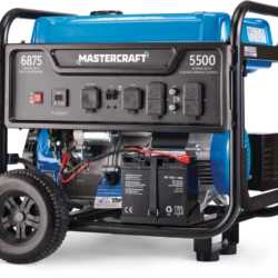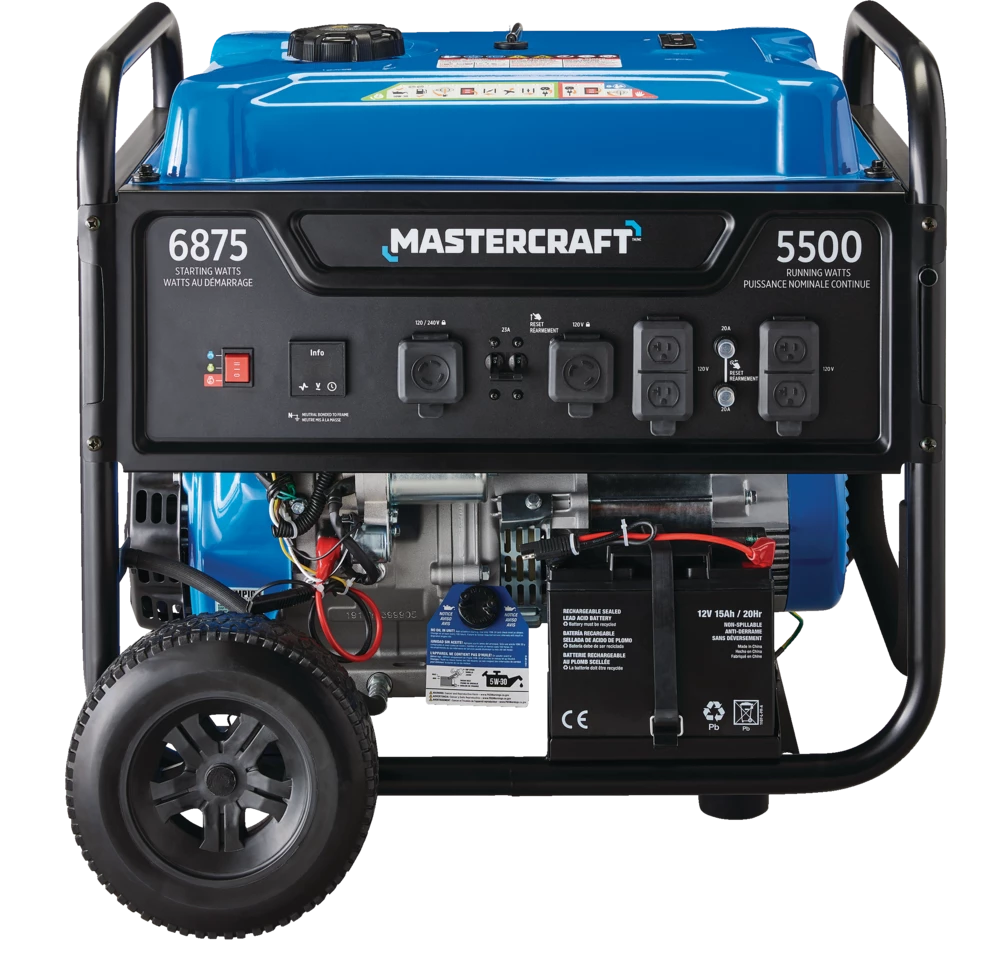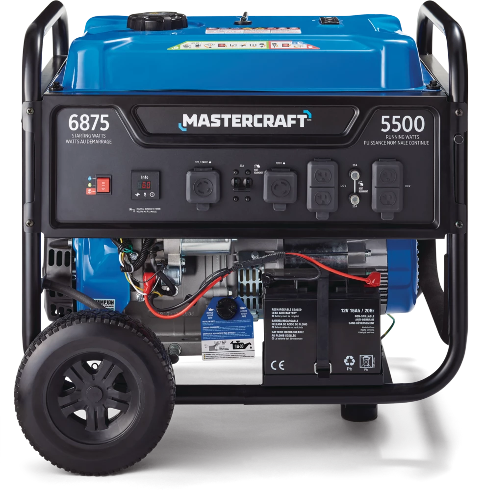 - Mastercraft 5500W Open Frame Generator with Electric Start is powered by a 389cc OHV gas engine