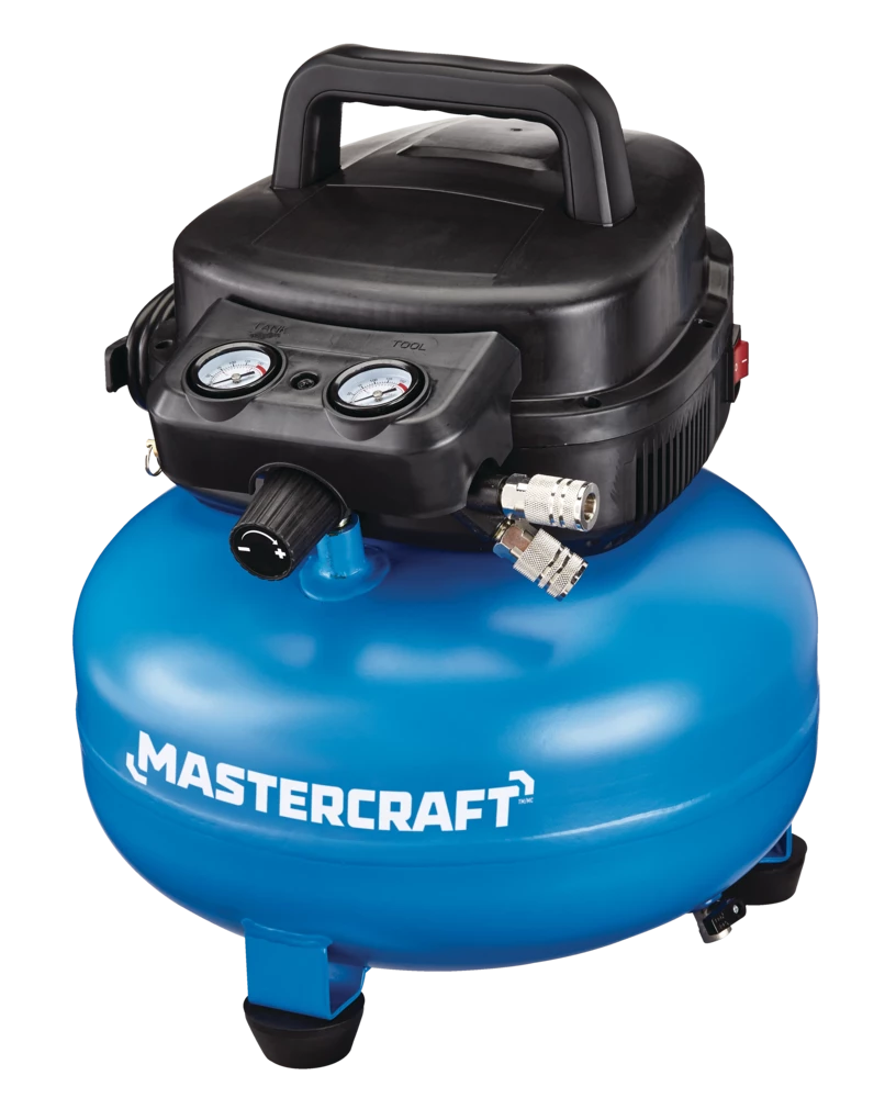 - Mastercraft 6-Gallon Pancake Compressor and 2″ Brad Nailer is ideal for those looking to work on cabinets, chair rails, decorative trim, furniture, molding, paneling, picture frames, rattan, scribe molding, and upholstery