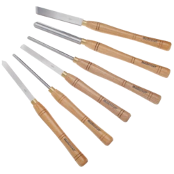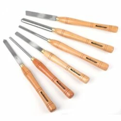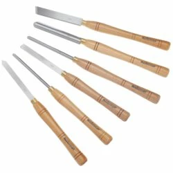 - Set comes with: 1″ (25.4 mm) skew, 21/32″ (17 mm) parting tools, 21/32″ (17 mm) round nose, 25/64″ (10 mm) gouge, 1/2″ (12.7 mm) gouge, 1″ (25.4 mm) gouge