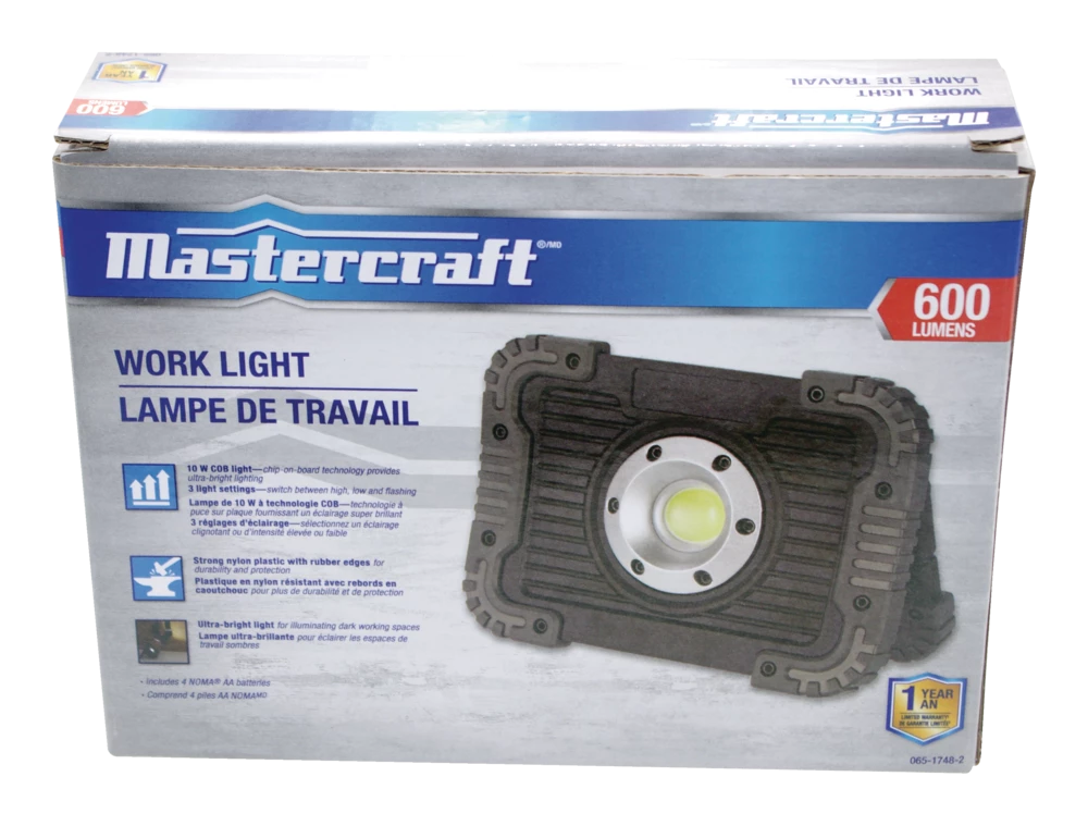 - Mastercraft 600 Lumen Utility Light is a powerful work light with durable construction