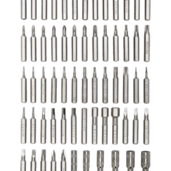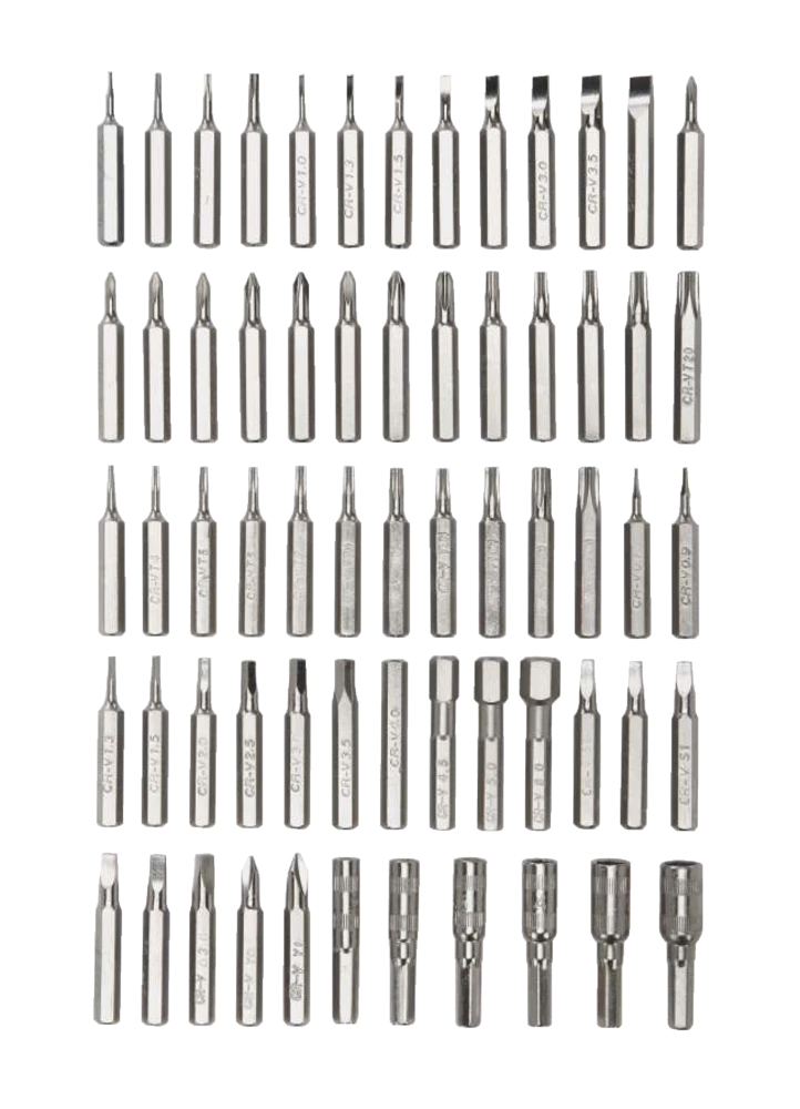 - Set includes 6 nut drivers (2.5, 3, 3.5, 4, 4.5, 5 mm) and 57 bits (4pc pentalobe: 0.8, 2, 5, 6; 8pc slotted: 1, 1.3, 1.5, 2, 2.5, 3, 3.5, 4 mm; 5pc Phillips: #000, #00, #0, #1, #2; 4pc JIS: 000, 00, 0, 1; 10pc torx: T3, T4, T5, T6, T7, T8, T9, T10, T15, T20; 6pc security torx: T7H, T8H, T9H, T10H, T15H, T20H; 12pc hex: 0.7, 0.9, 1.3, 1.5, 2, 2.5, 3, 3.5, 4, 4.5, 5, 6mm; 5pc square: #0x2, #1×2, #2; and 1pc triangle: 3mm; 2pc tri-wing: #0, #1)