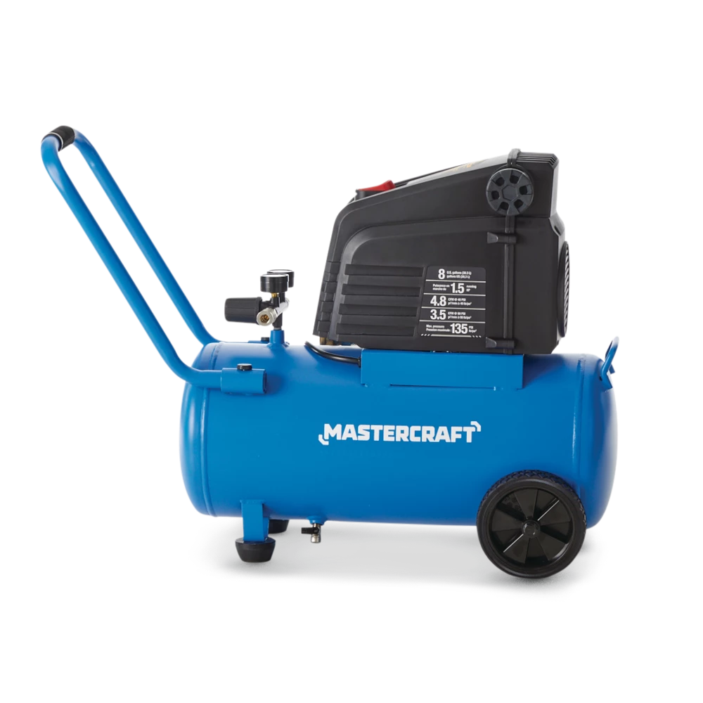 - Mastercraft 8 Gallon Air Compressor features 135 max PSI, 1.5 running HP and is oil free for less maintenance