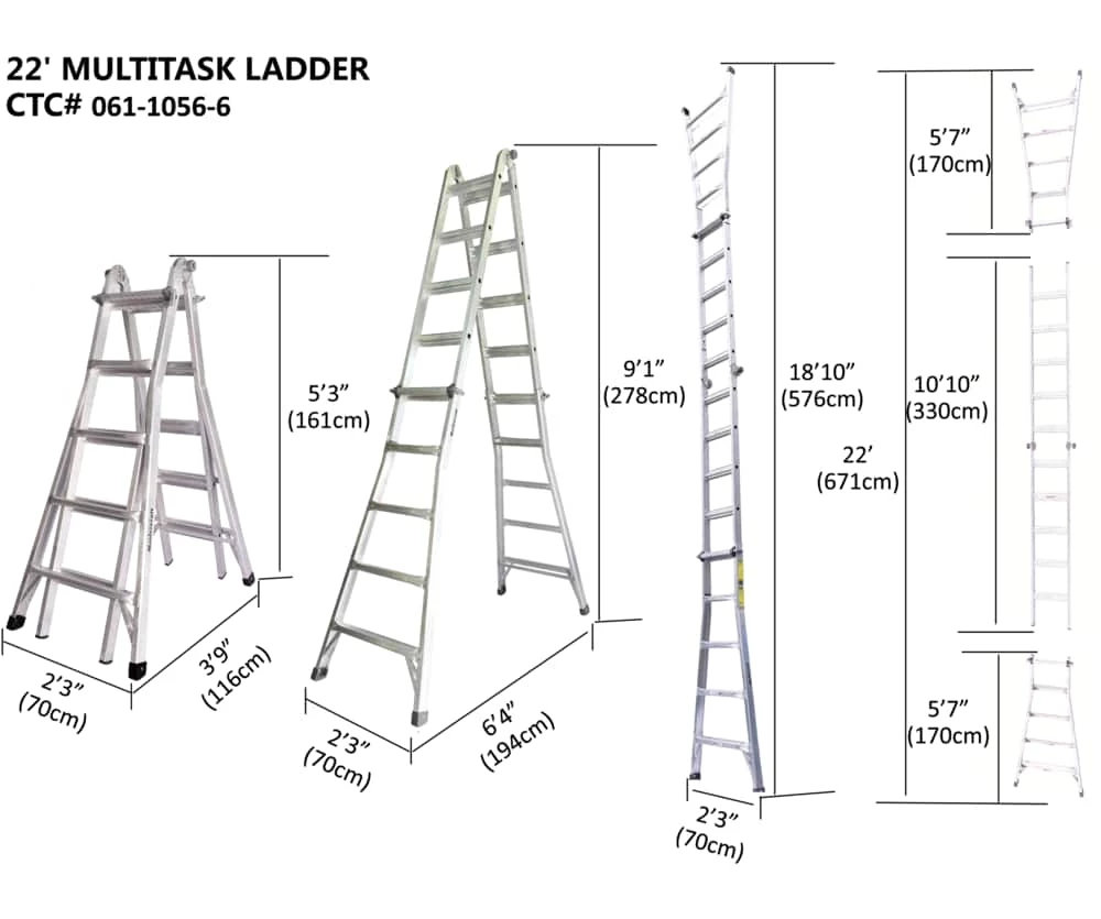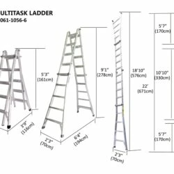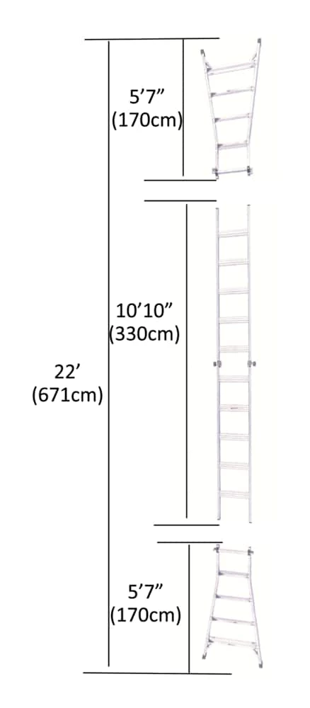 - Note: The market practice on multi-task ladders is to identify them by the equivalent reach height of an extension ladder. On full extension mode overlap is required, but the ladder will allow you to reach 21′ (assumes a 5’6″ individual with a vertical 12″ reach).