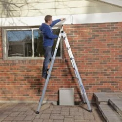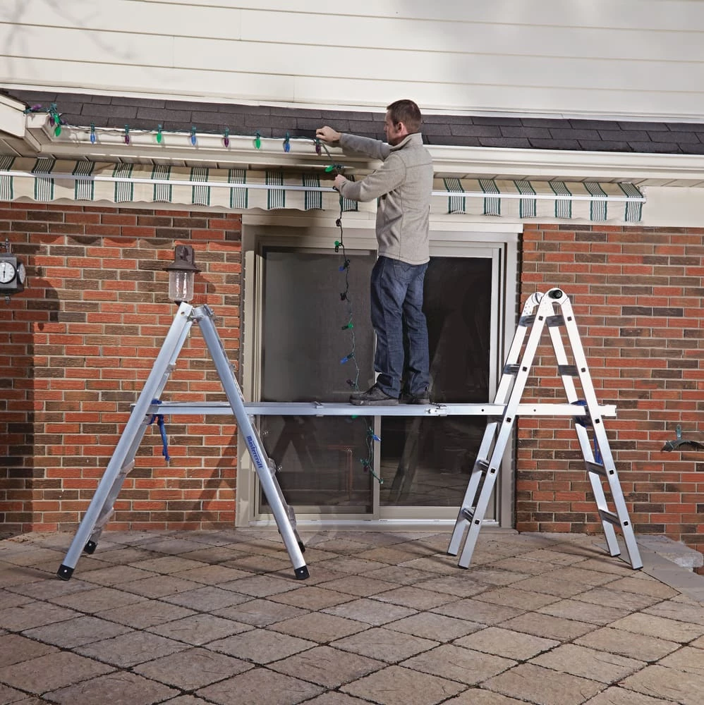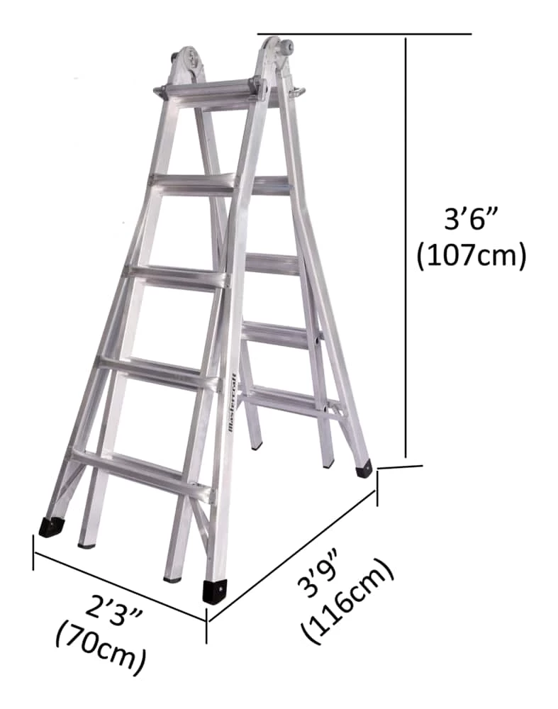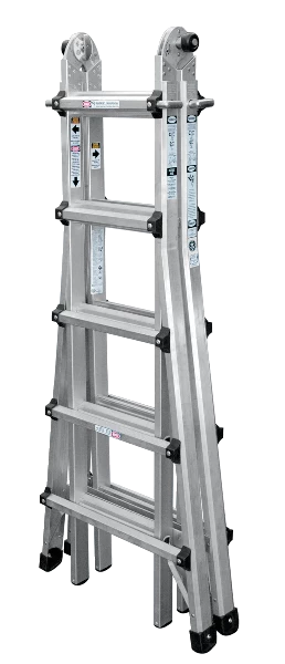 - Design allows use in 4 different positions: twin stepladder, extension ladder, stairway stepladder and as 2 scaffold bases