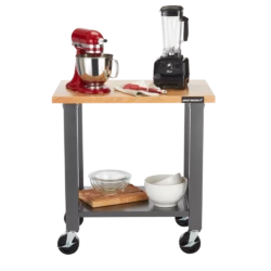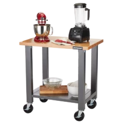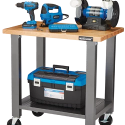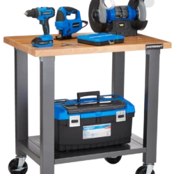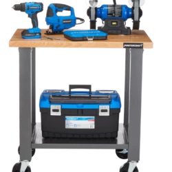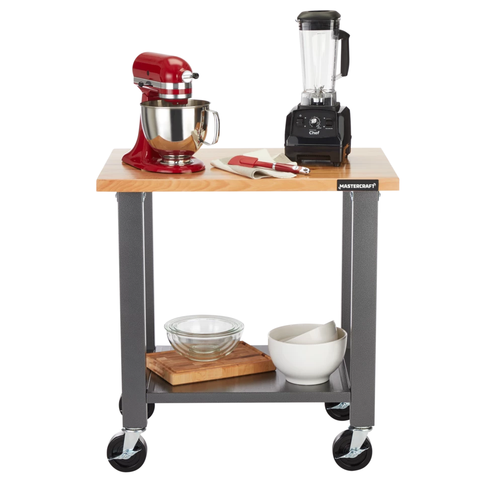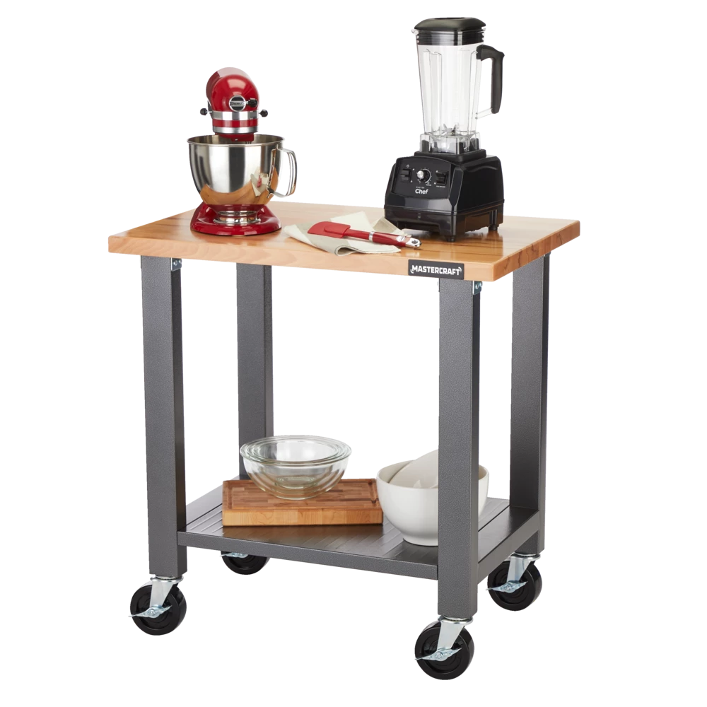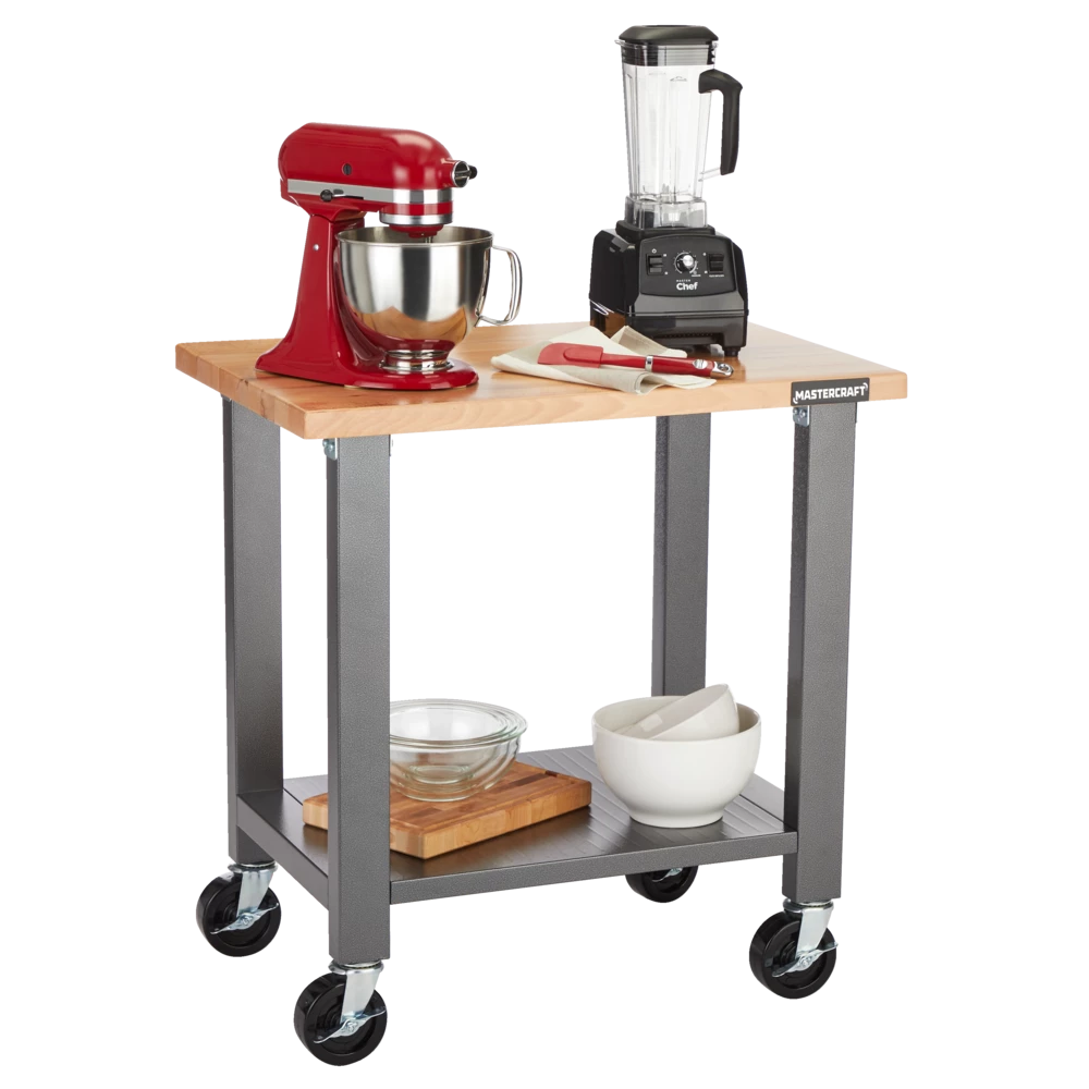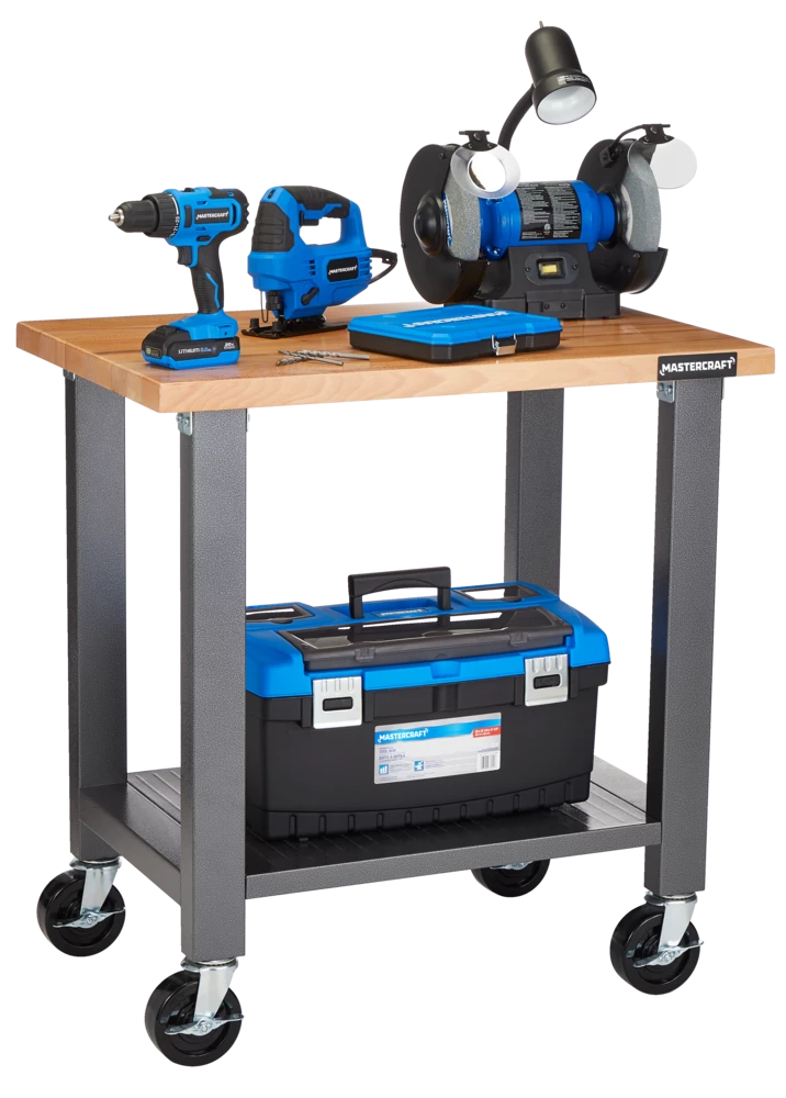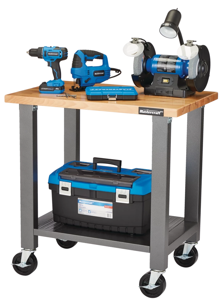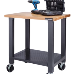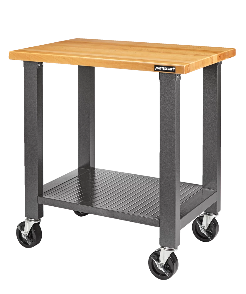 - Mastercraft Heavy-Duty Work Table features a solid wood top and steel shelf bottom