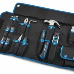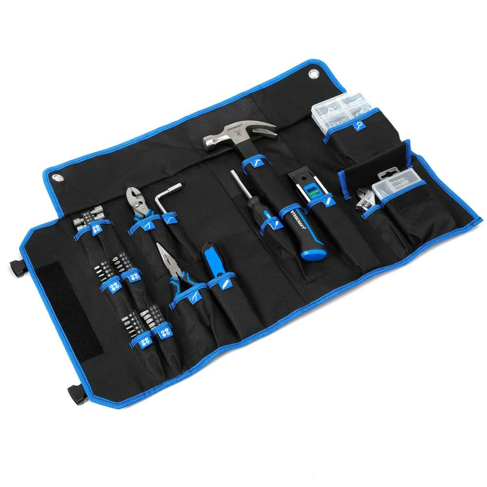 - Pieces Included: Fasteners, Driver Bits, Hammer, Level, Nut Driver, Pliers, Screwdriver, Utility Knife, Wrench