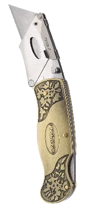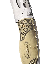 Mastercraft Limited Edition Folding Utility Knife features an antique brass handle embossed with a unique design