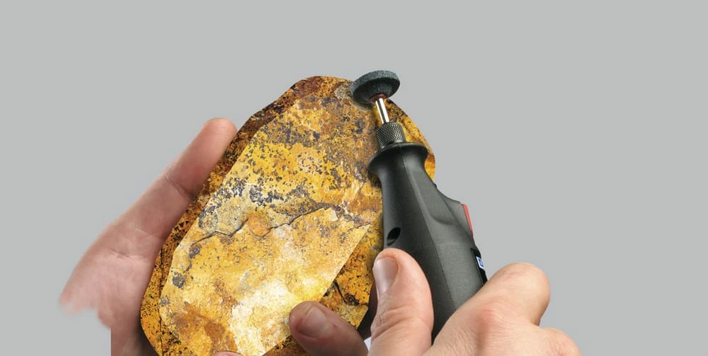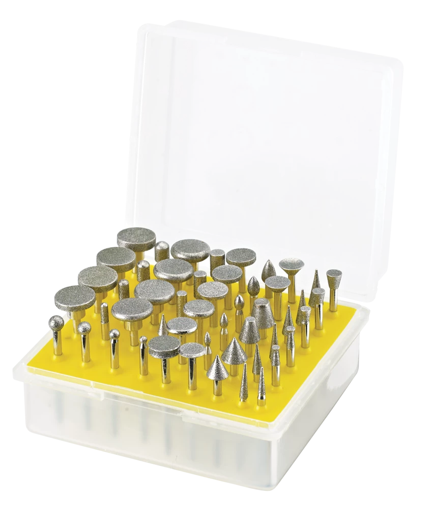 - 50 Piece Diamond Mounted Point Rotary Set has a diamond grit for removal of burns on glass, metal, stone, wood, ceramics, fiberglass and plastic
