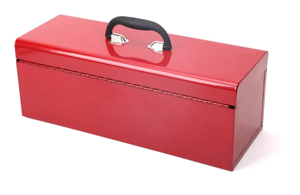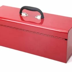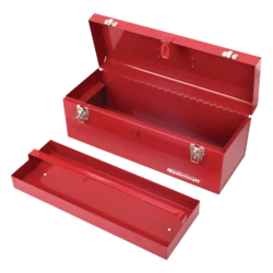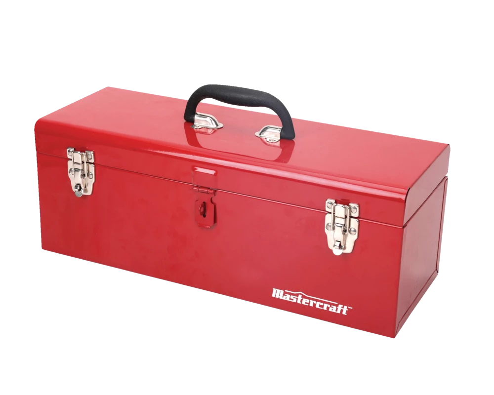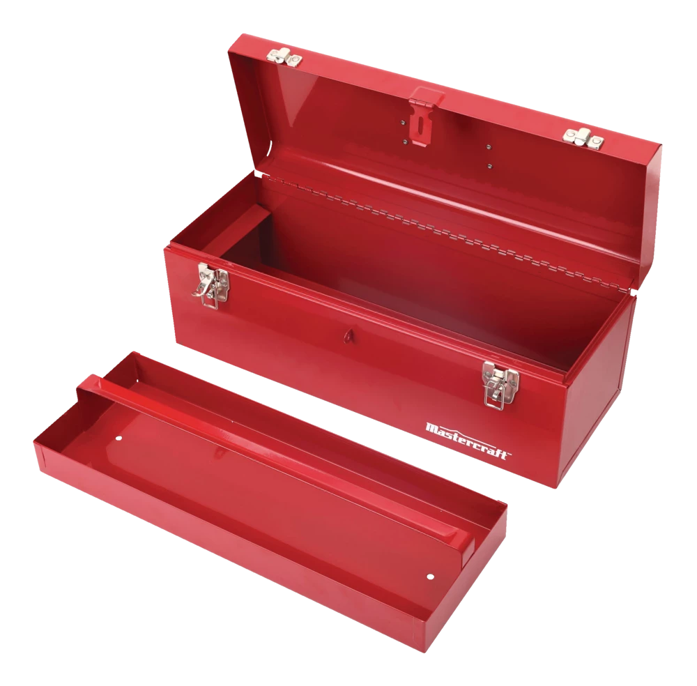 - Mastercraft Red Metal Toolbox features a watershed-hinge design that shields the hinge from moisture and dirt, extending its life
