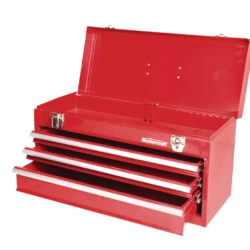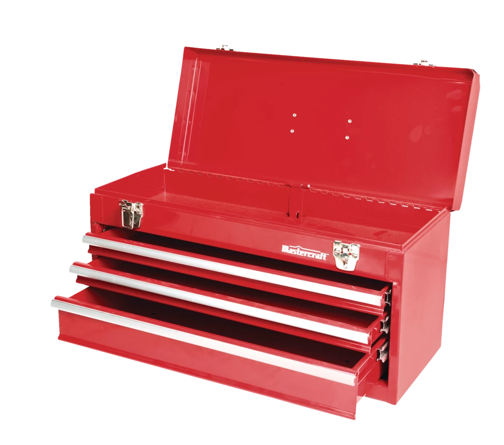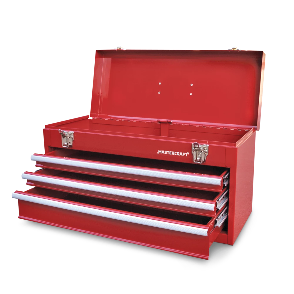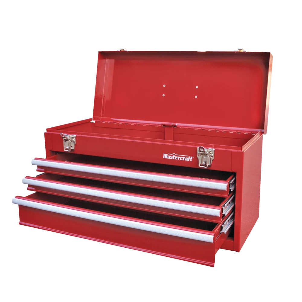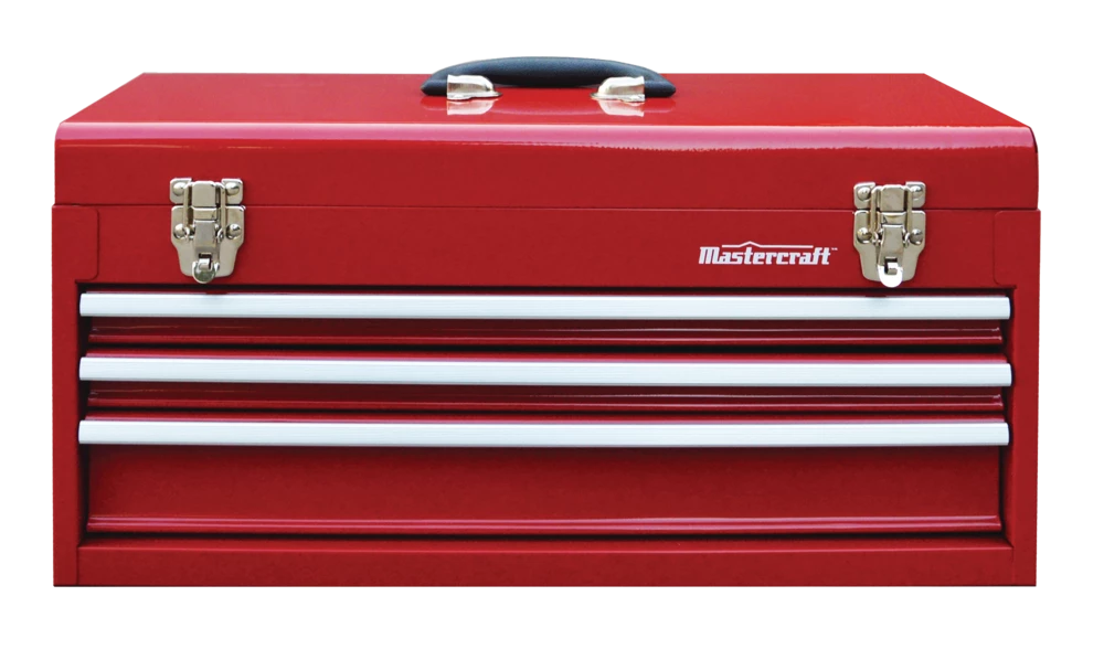 - Mastercraft Red Metal 3-Drawer Chest features a portable design for easy use anywhere