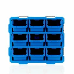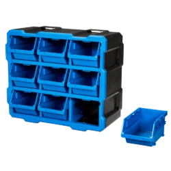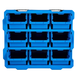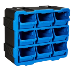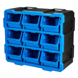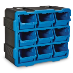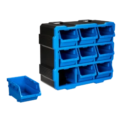 - Mastercraft Raxx 9-Bin Parts Cabinet includes 9 bins that can be stacked, nested, and side locked