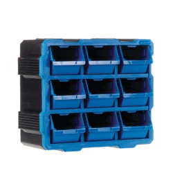 - Mastercraft Raxx 9-Bin Parts Cabinet includes 9 bins that can be stacked, nested, and side locked