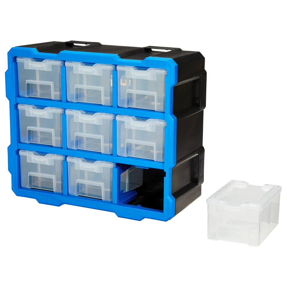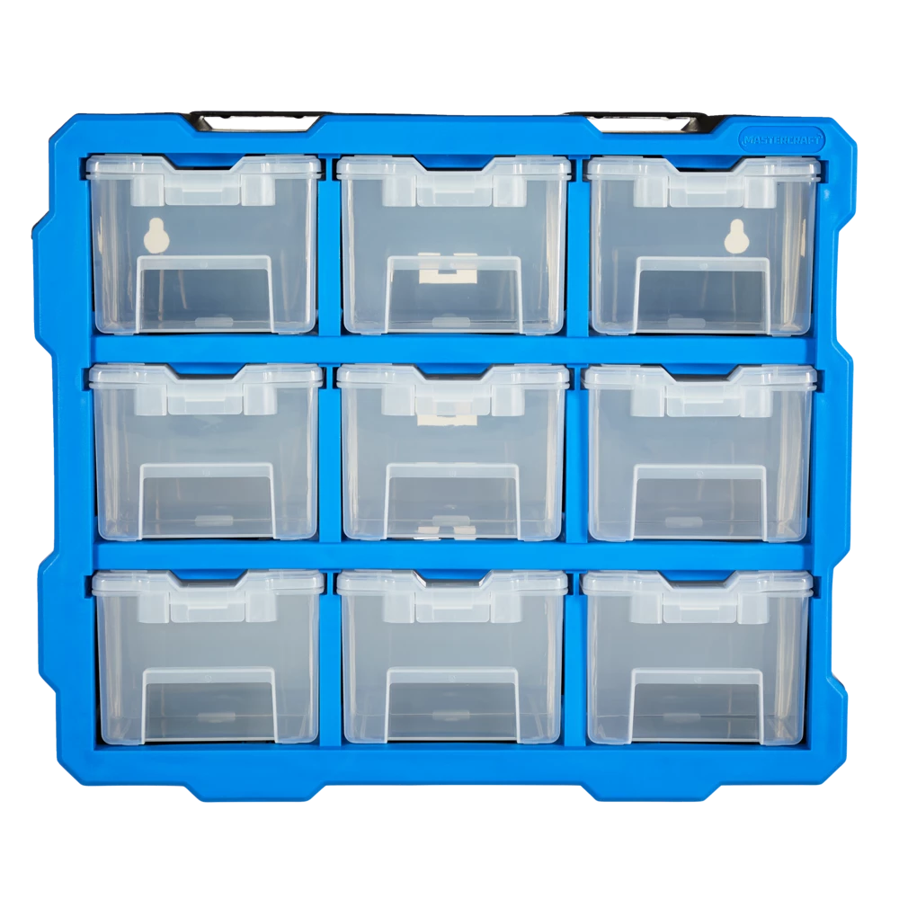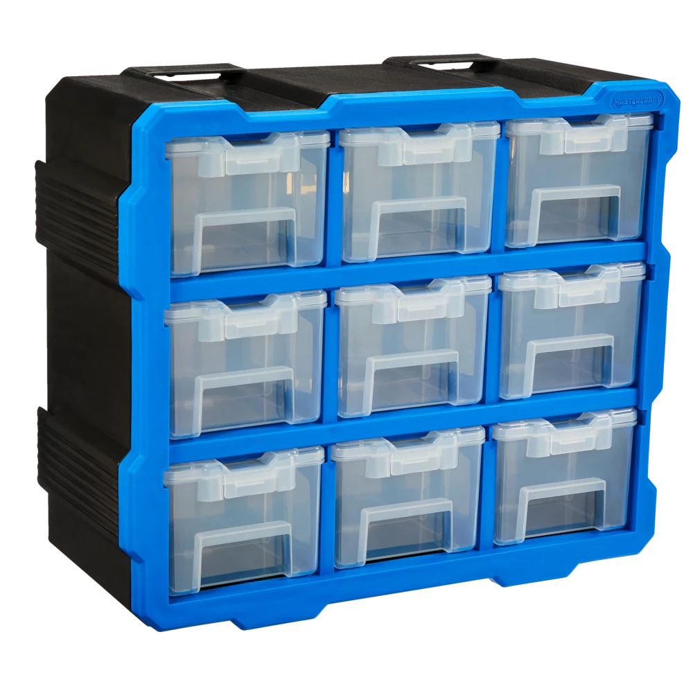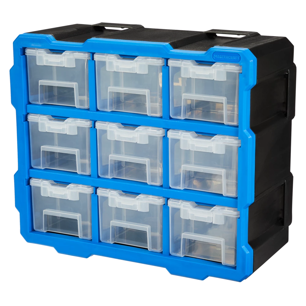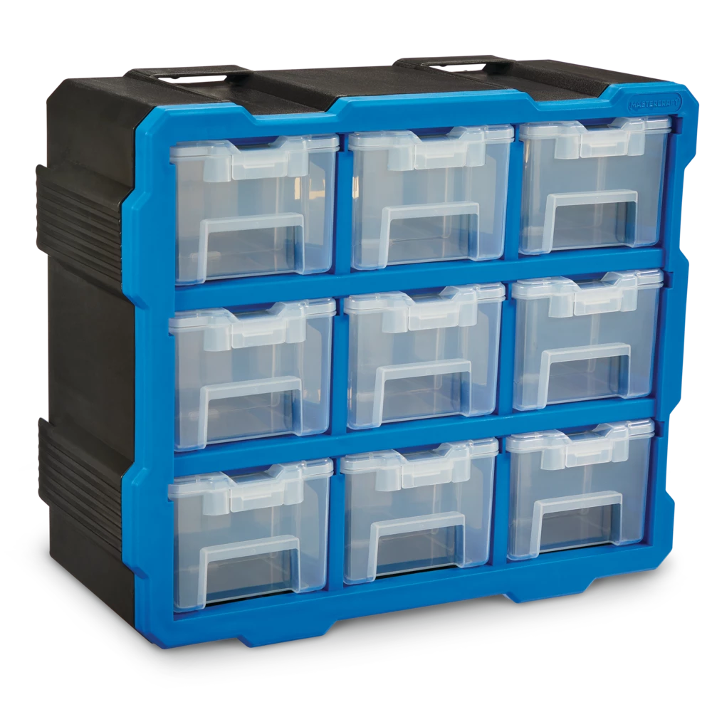 - Mastercraft Raxx 9-Bin Parts Cabinet with Lid features 4 large organizers and 13 compartments that can be stacked, nested, and side locked