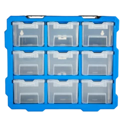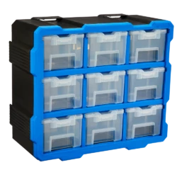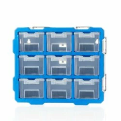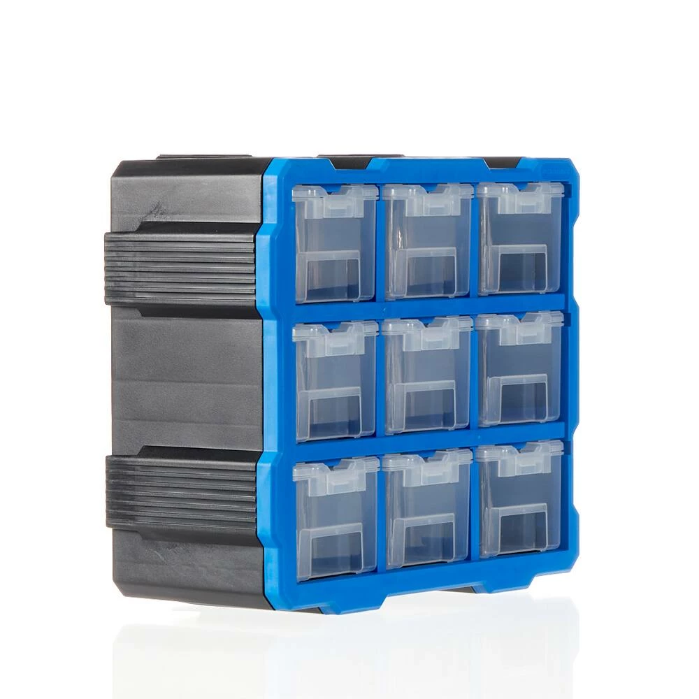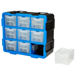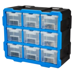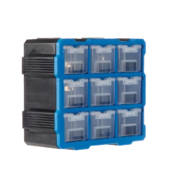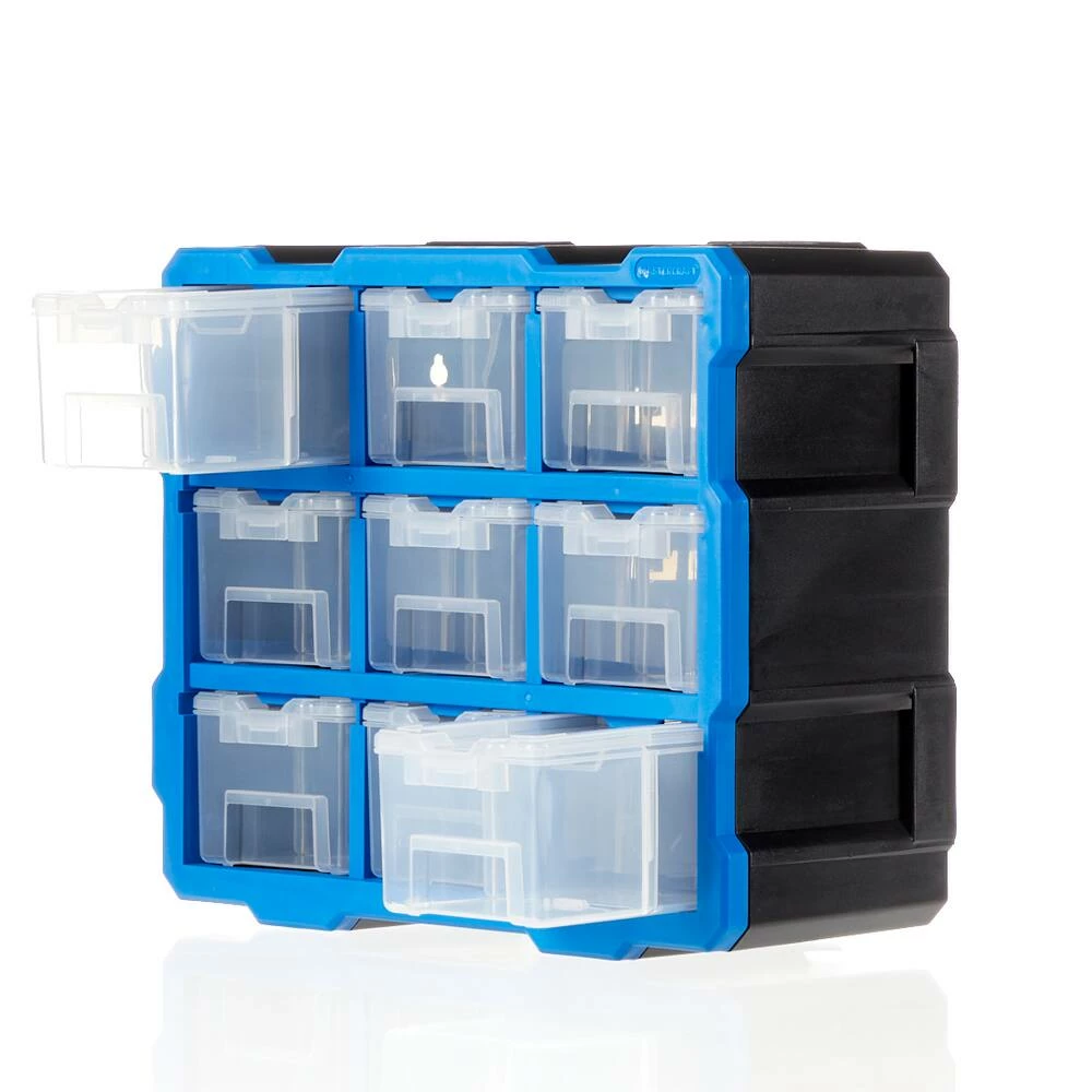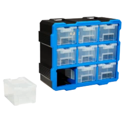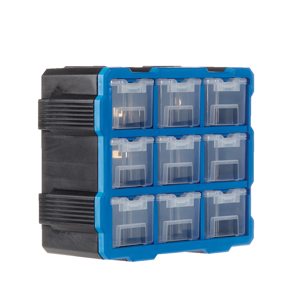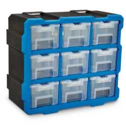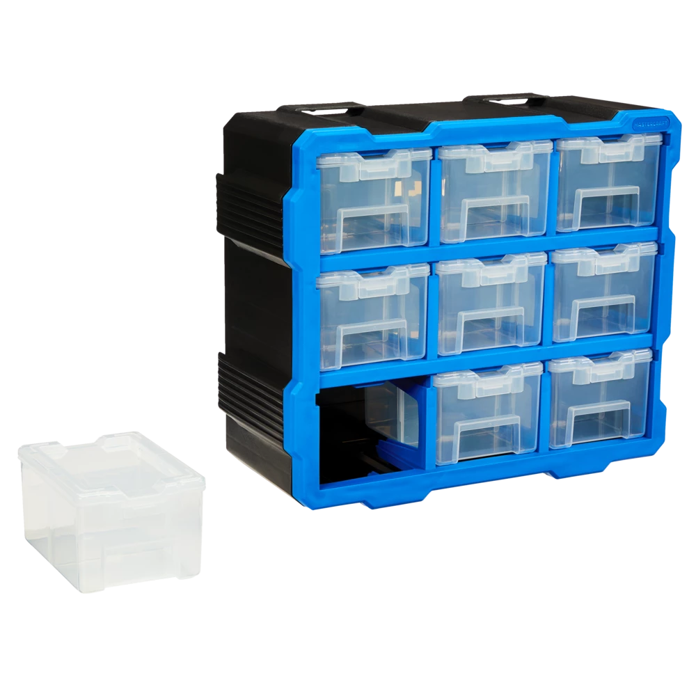 - Mastercraft Raxx 9-Bin Parts Cabinet with Lid features 4 large organizers and 13 compartments that can be stacked, nested, and side locked