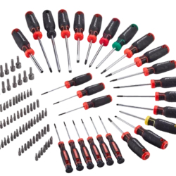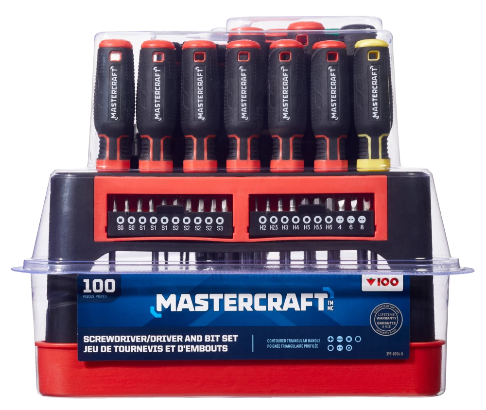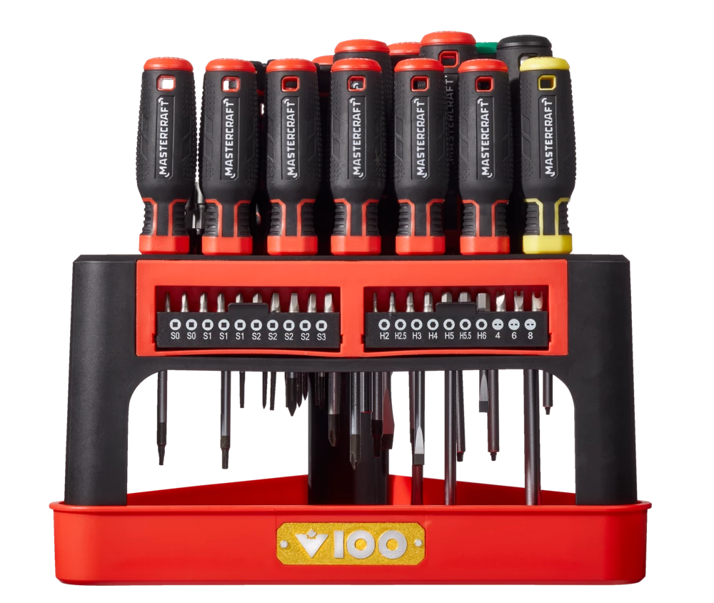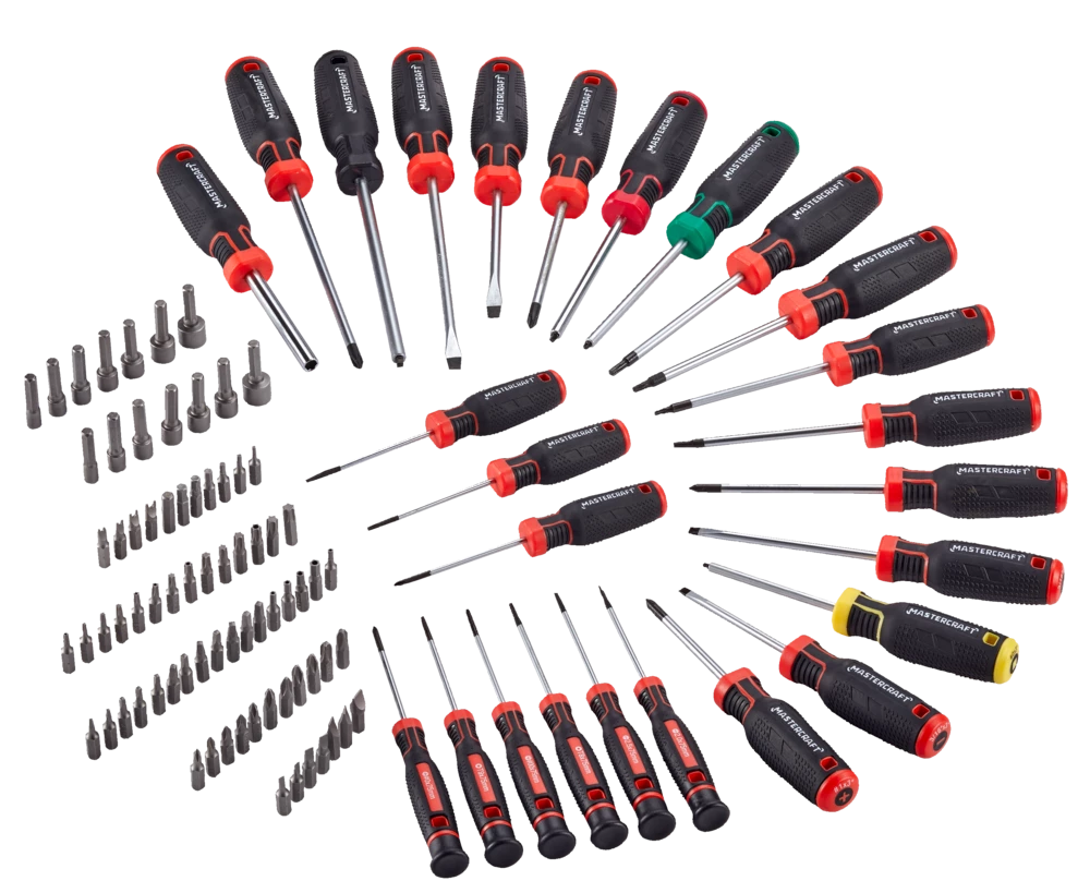 - Mastercraft 100-Piece Screwdriver & Bit Set features contoured rubberized grips for comfort and control