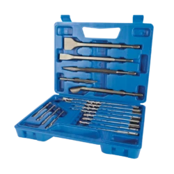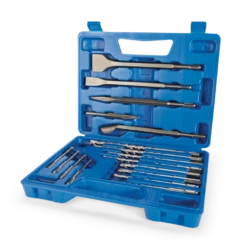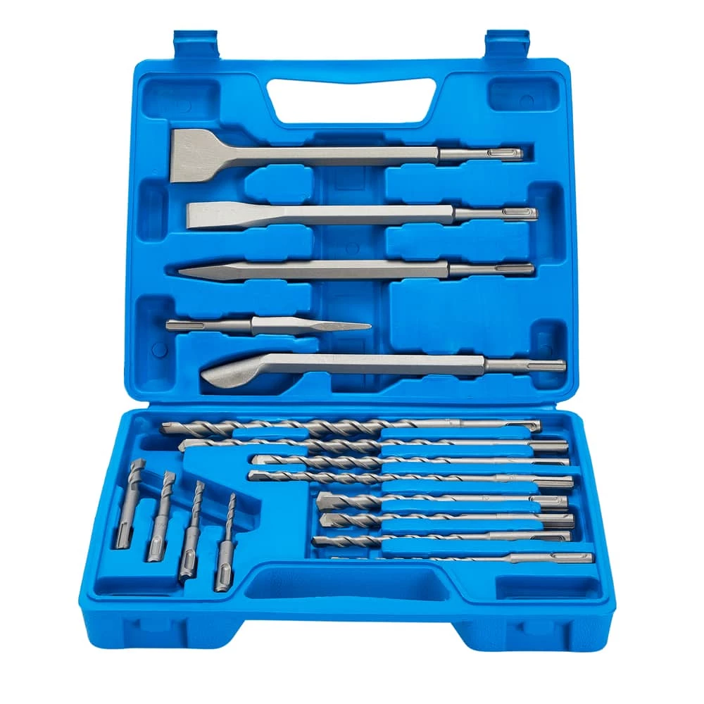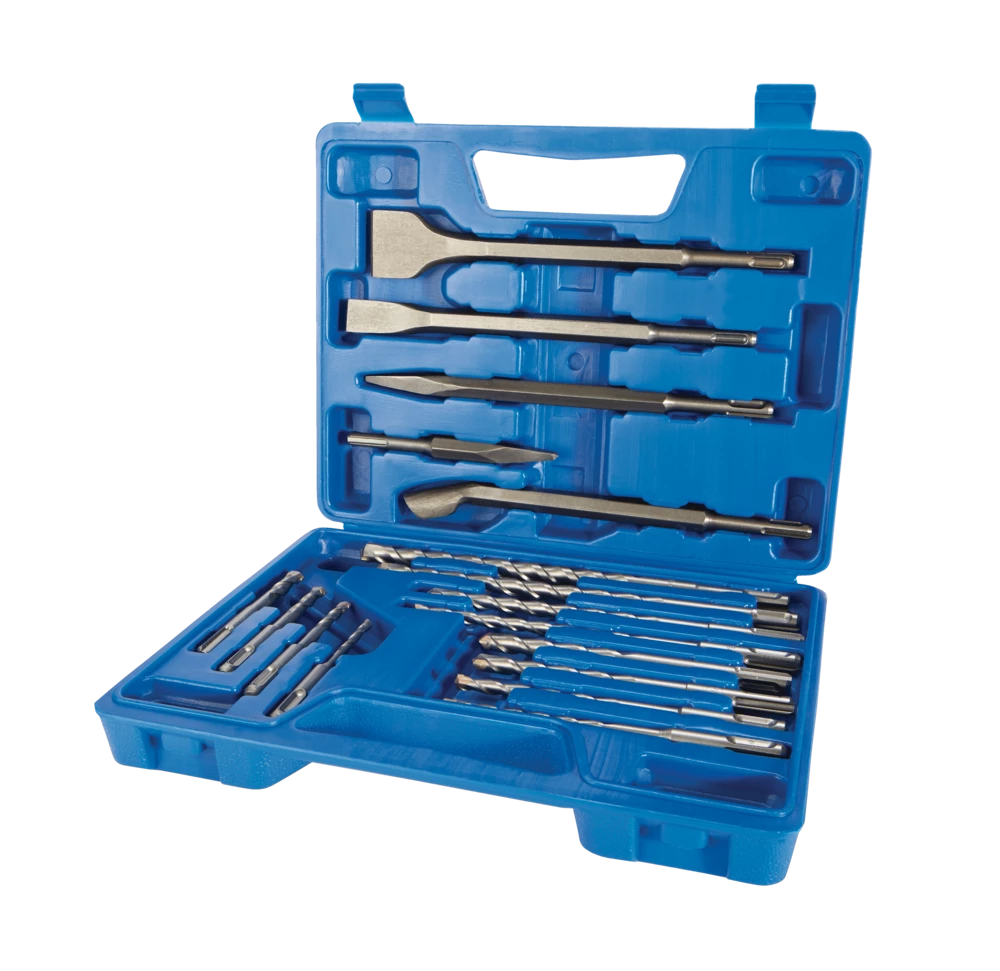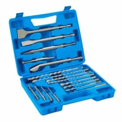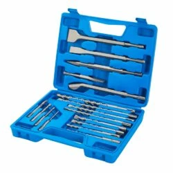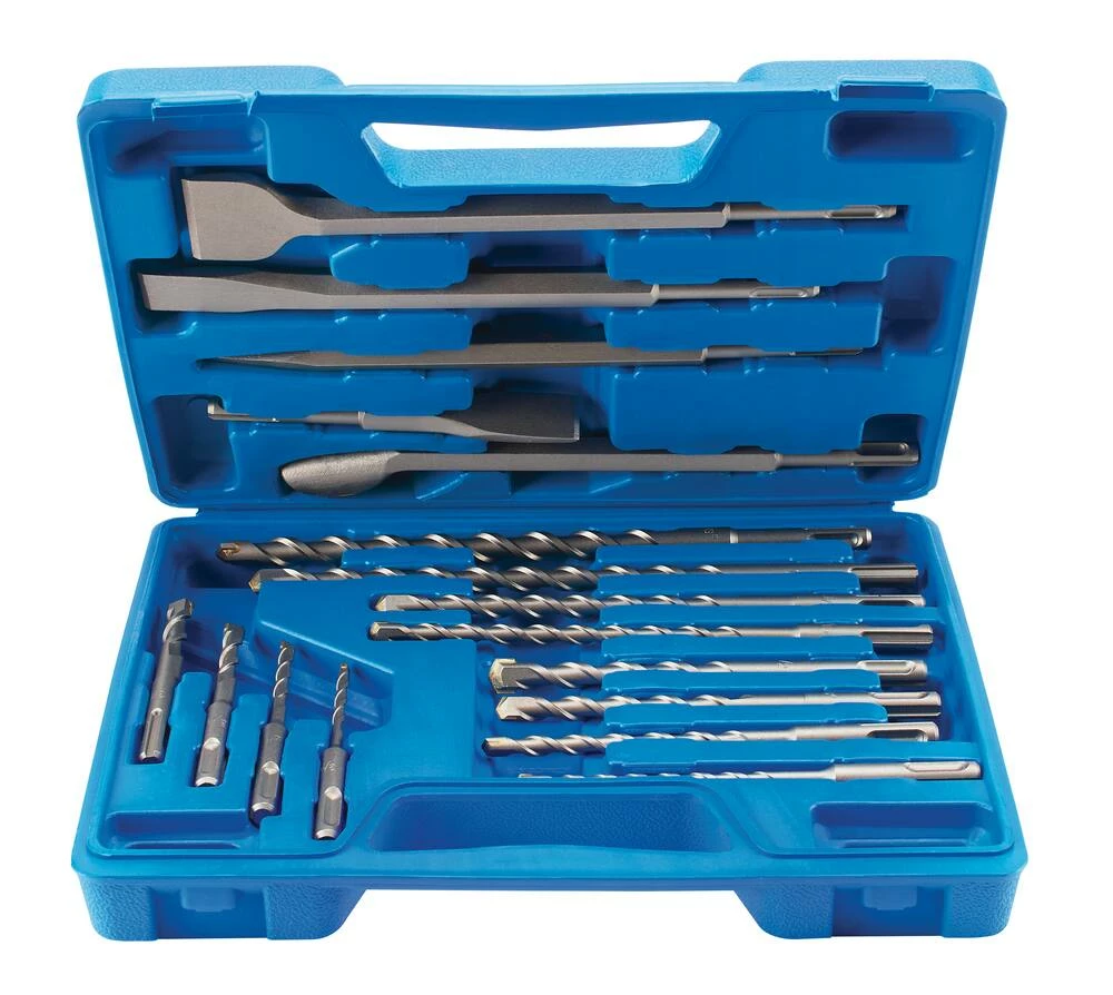 - Set includes: (1) 3/16″ x 4″ (4.8 x 102 mm), (1) 1/4″ x 4″ (6.4 x 102 mm), (1) 5/16″ x 4″ (1.6 x 102 mm), (1) 3/8″ x 4″ (9.5 x 102 mm), (1) 1/4″ x 6″ (6.4 x 152.4 cm), (1) 5/16″ x 6″ (1.6 x 152.4 mm), (1) 3/8″ x 6″ (9.5 x 152.4 mm), (1) 1/2″ x 6″ (12.7 x 152.4 mm), (1) 5/16″ x 8″ (1.6 x 203.2 mm), (1) 3/8″ x 8″ (9.5 x 203.2 mm), (1) 1/2″ x 10″ (12.7 x 254 mm) and (1) 9/16″ x 10″ (14.3 x 254 mm) drill bits, (1) point chisel, (3) flat chisel and (1) groove chisel