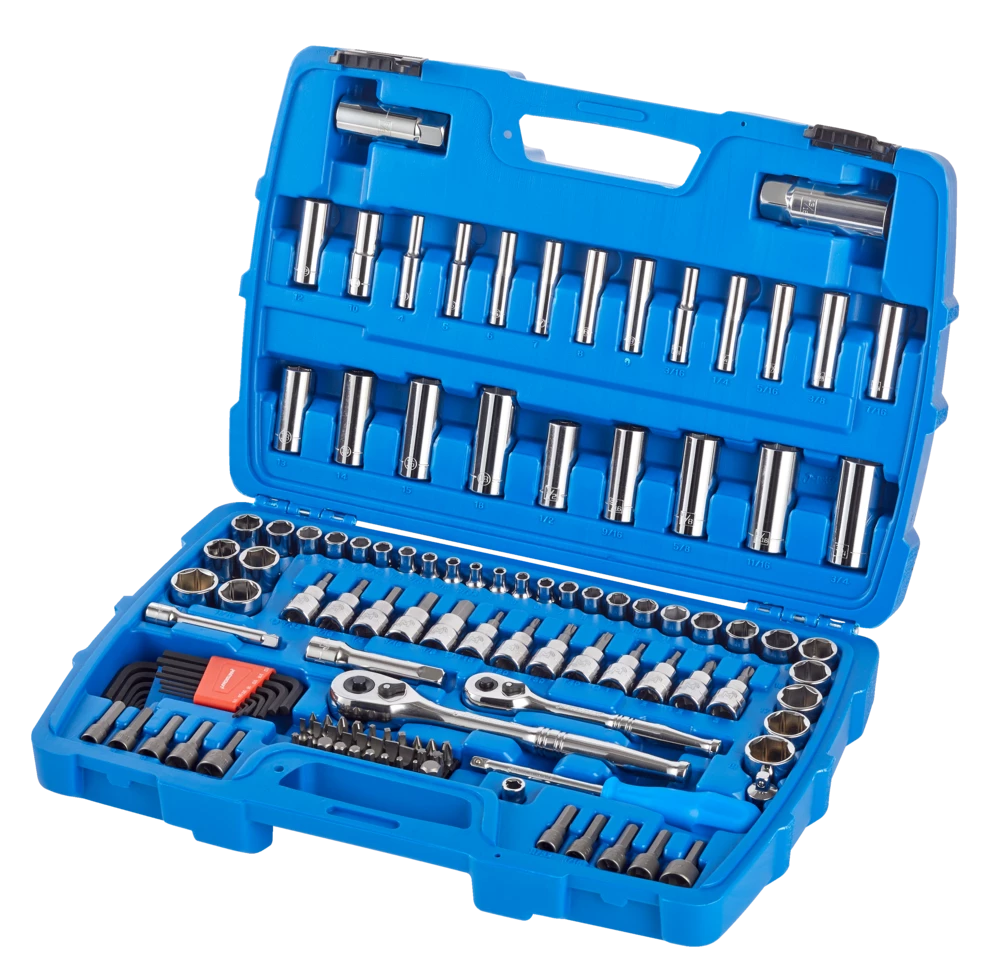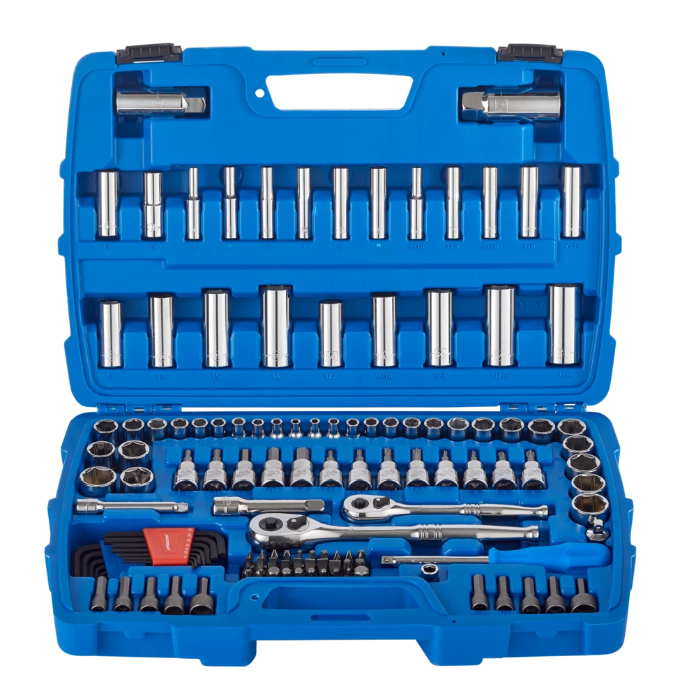 - Pieces Included: Case, Adapters, Deep Sockets, Driver Bits, Extension Bars, Hex Keys, Nut Setters, Ratchet Wrench