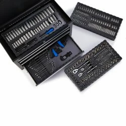 - Includes 3 ratchets (1/4″, 3/8″, and 1/2″ drive), 67 1/4″ drive 6pt and 12pt sockets, 54 3/8″ drive 6pt sockets, 48 1/2″ drive 6pt sockets, 43 bit sockets, 12 combination wrenches, and assortment of accessories, insert bits, and hex keys