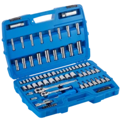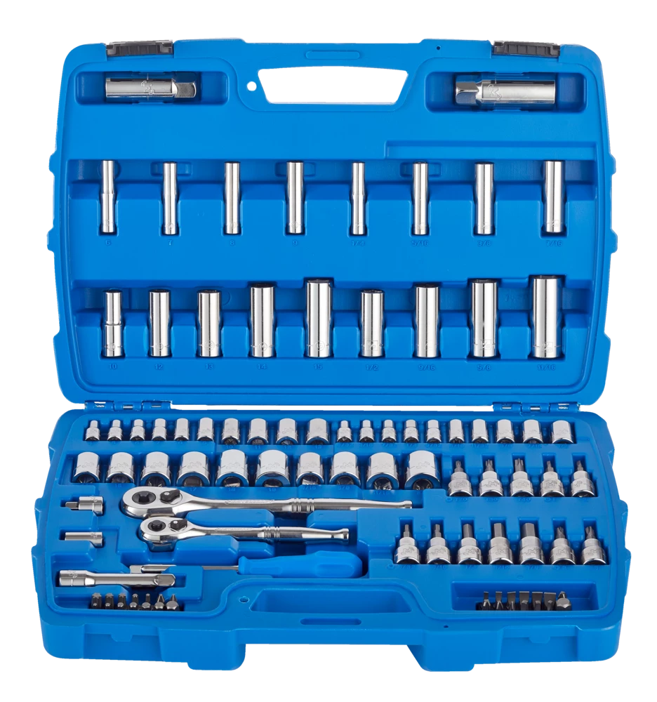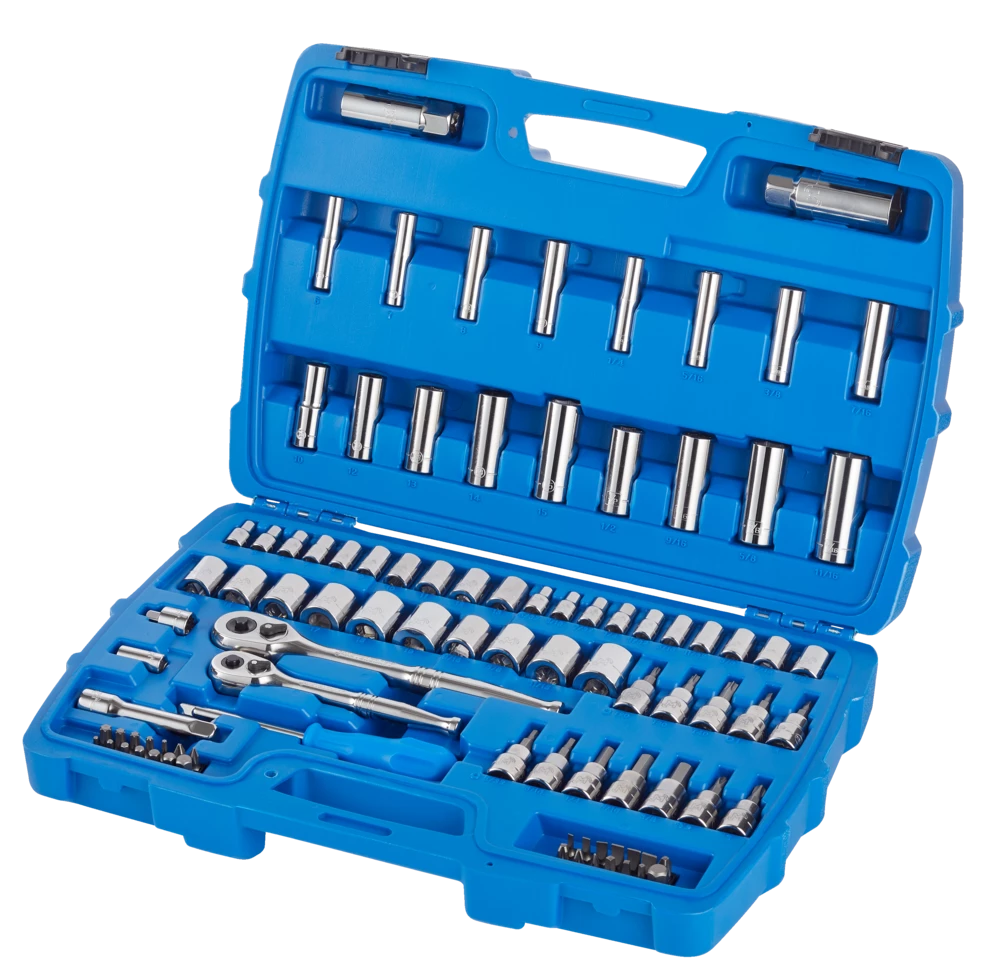 - Includes: 3/8″-drive accessories: 10 standard 6pt sockets, 9 deep 6pt sockets, 12 bit sockets, two spark plug sockets, one ratchet, one extension bar