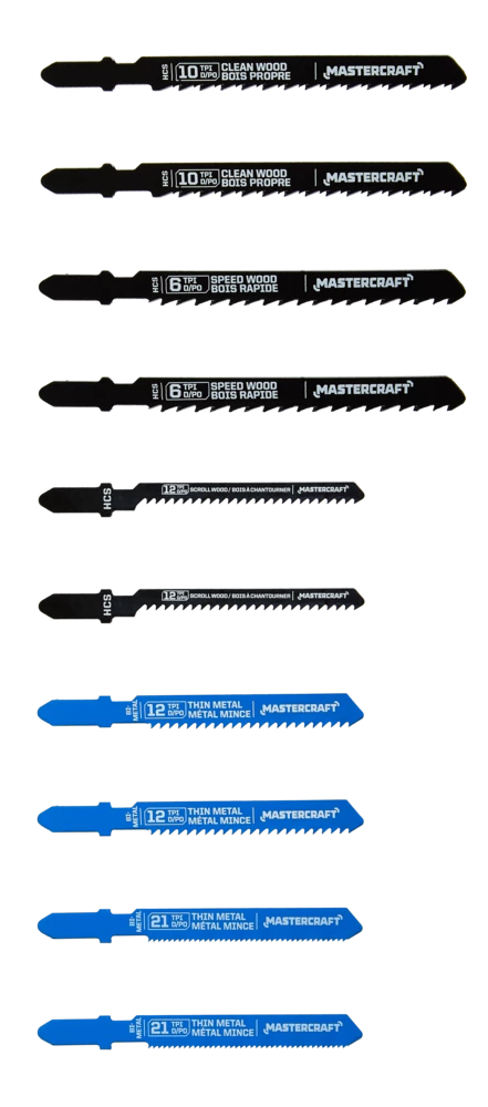- Mastercraft T-Shank Jig Blade Set includes blades for general-purpose woodworking and for thick and thin metals