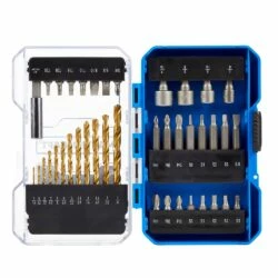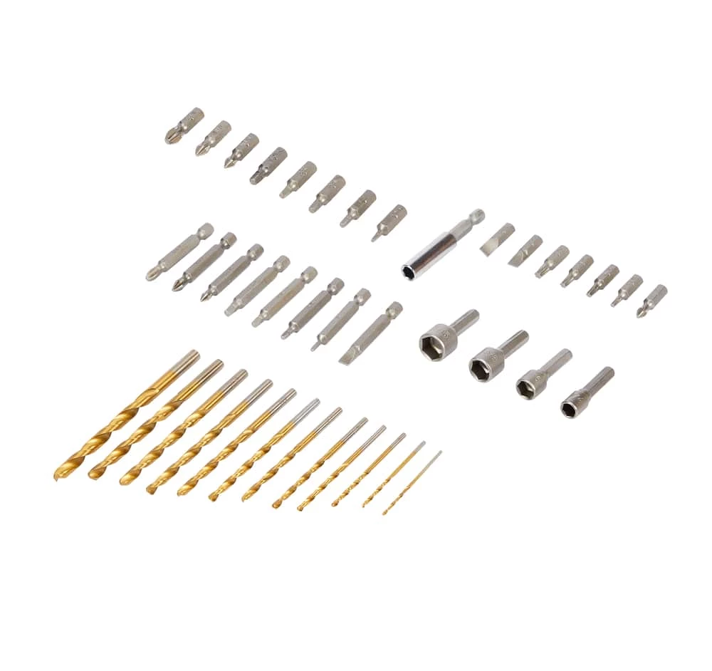 - 12-piece titanium-coated drill bits, 23 popular types and sizes of screw bits, 4 nut setters, and magnetic bit holder