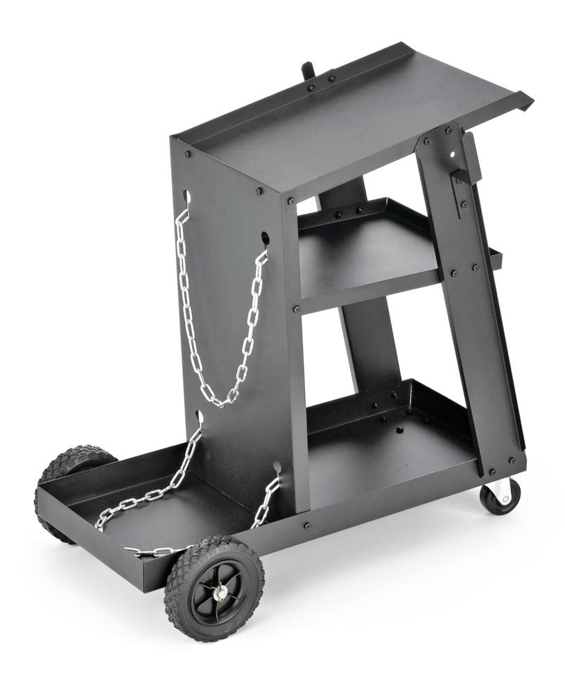 - Three-tier shelves designed to hold all portable MIG welders, stick welders and plasma cutters, accessories, consumables, and gas cylinder